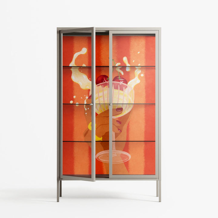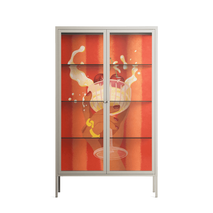 Drink And Cherries by Raissa Oltmanns, displayed within the Vitrine Cabinet behind Clear glass. Finished in the colour Pebble, the cabinet becomes a frame for the artwork and the objects within.