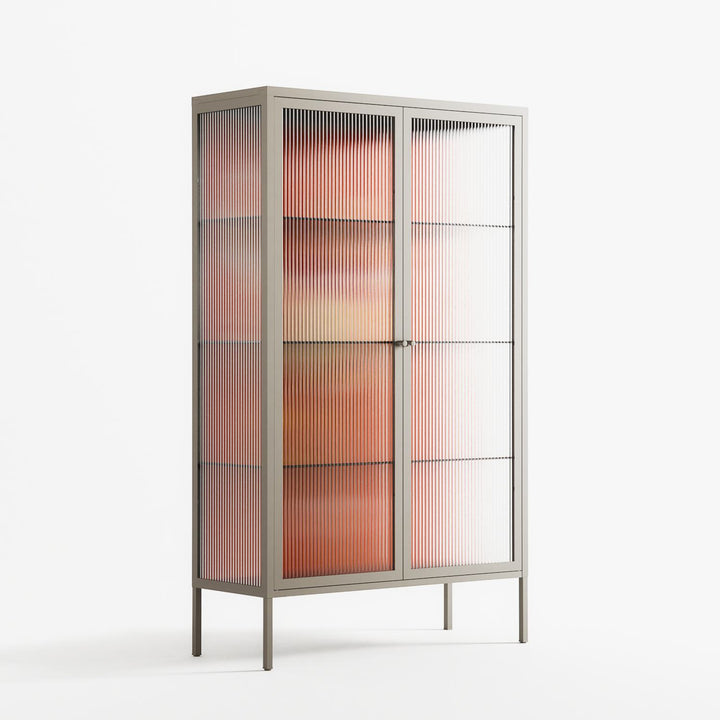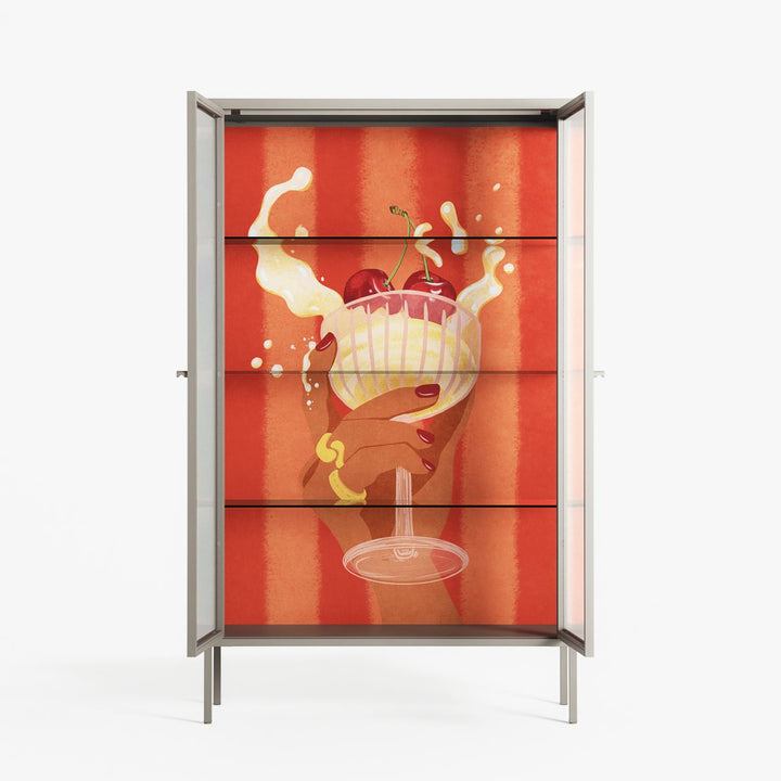 Drink And Cherries by Raissa Oltmanns, displayed within the Vitrine Cabinet behind Reeded glass. Finished in the colour Pebble, the cabinet becomes a frame for the artwork and the objects within.
