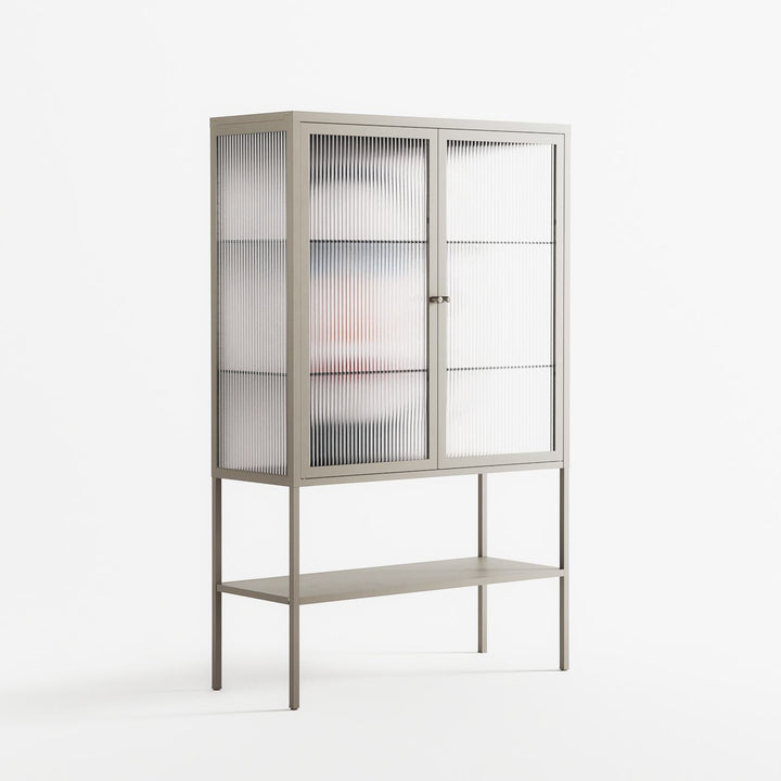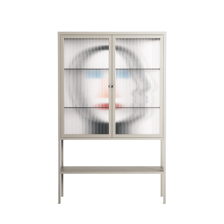 En_Suspend by David Vanadia, displayed within the Vitrine Loft Cabinet behind Reeded glass. Finished in the colour Pebble, the cabinet becomes a frame for the artwork and the objects within.