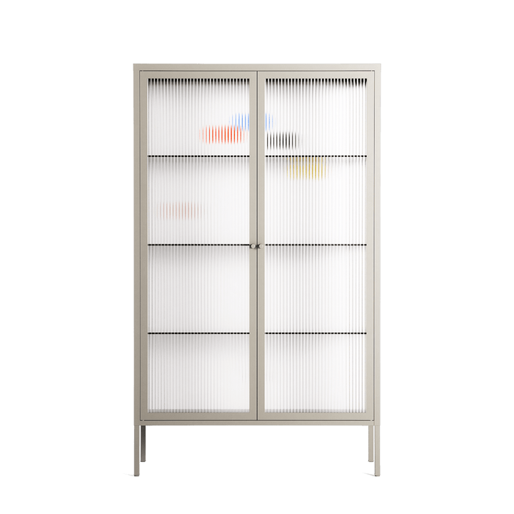 Épanoui by David Vanadia, displayed within the Vitrine Cabinet behind Reeded glass. Finished in the colour Pebble, the cabinet becomes a frame for the artwork and the objects within.