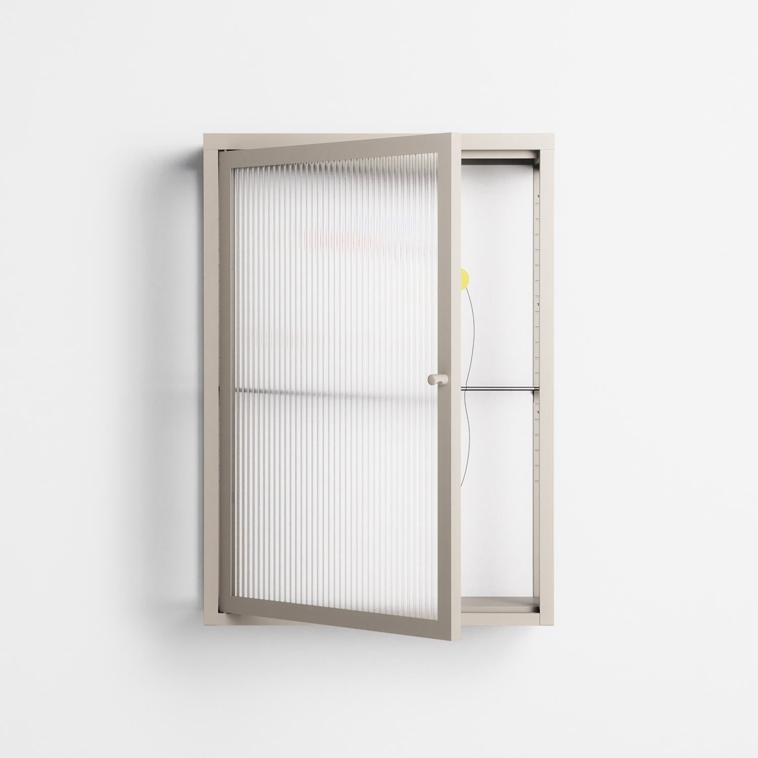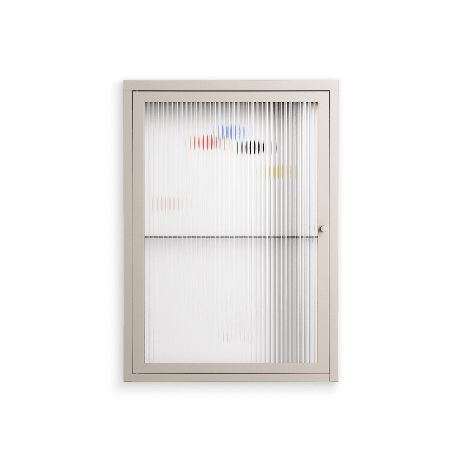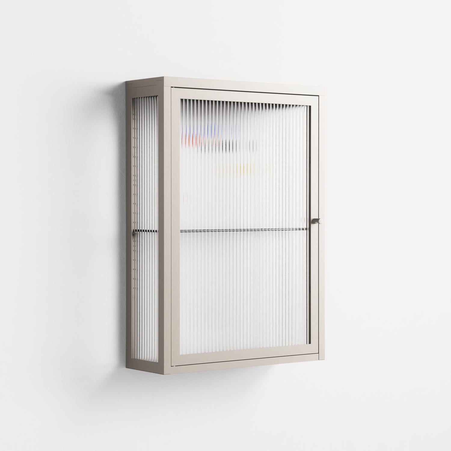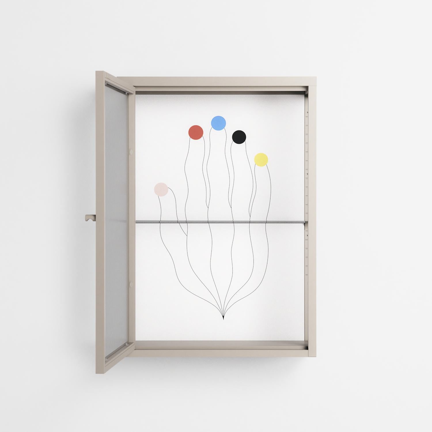 Épanoui by David Vanadia, displayed within the Vitrine Wall Cabinet behind Reeded glass. Finished in the colour Pebble, the cabinet becomes a frame for the artwork and the objects within.