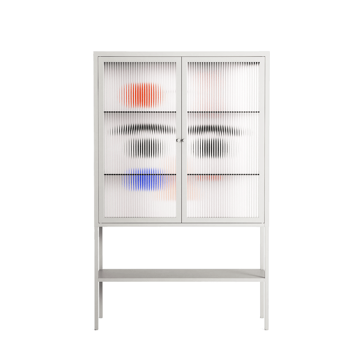 Équilibré by David Vanadia, displayed within the Vitrine Loft Cabinet behind Reeded glass. Finished in the colour Chalk, the cabinet becomes a frame for the artwork and the objects within.