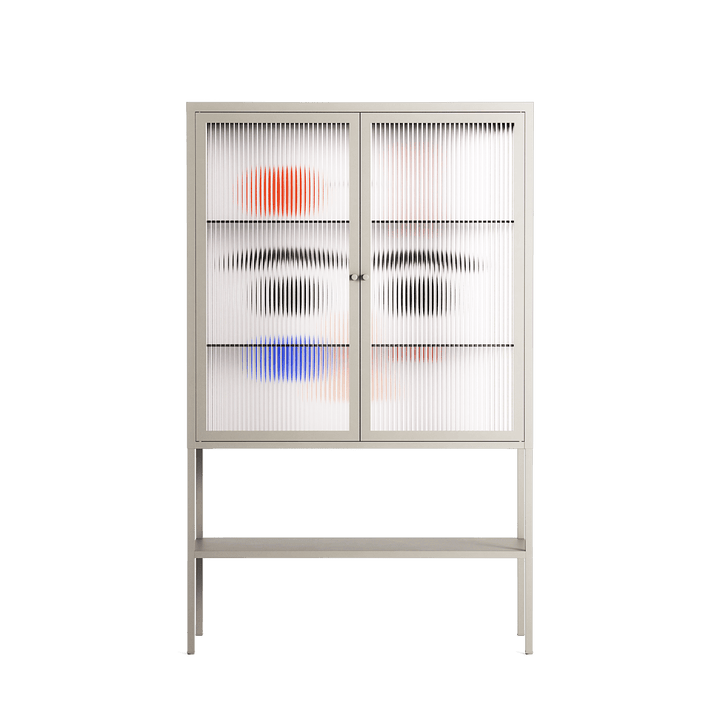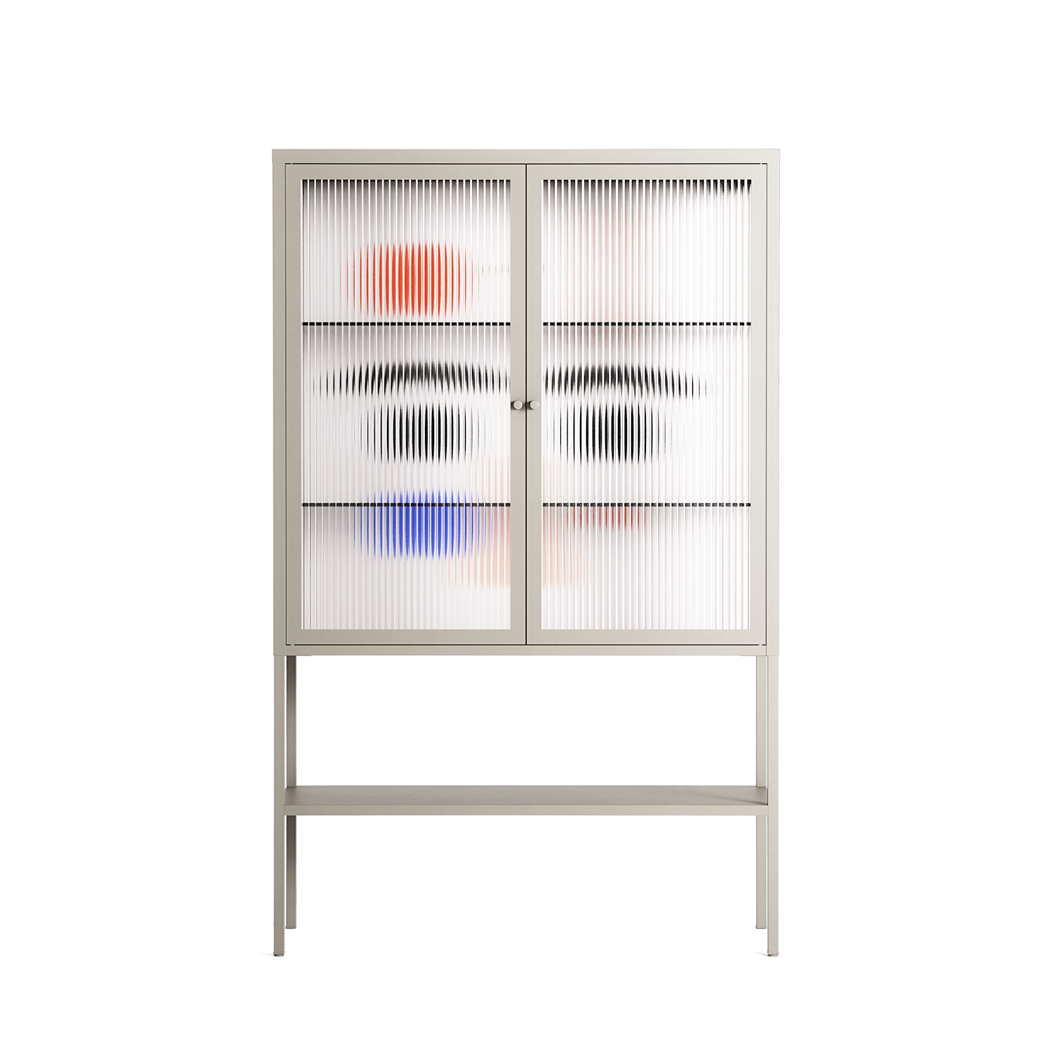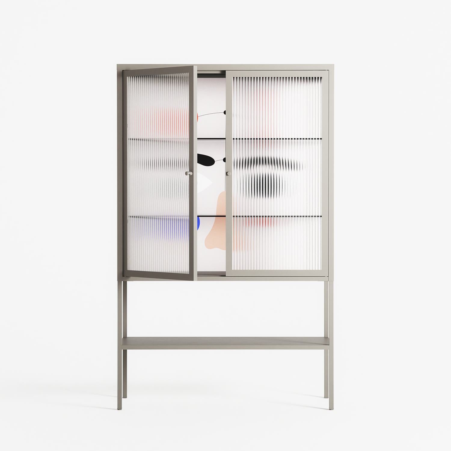 Équilibré by David Vanadia, displayed within the Vitrine Loft Cabinet behind Reeded glass. Finished in the colour Pebble, the cabinet becomes a frame for the artwork and the objects within.