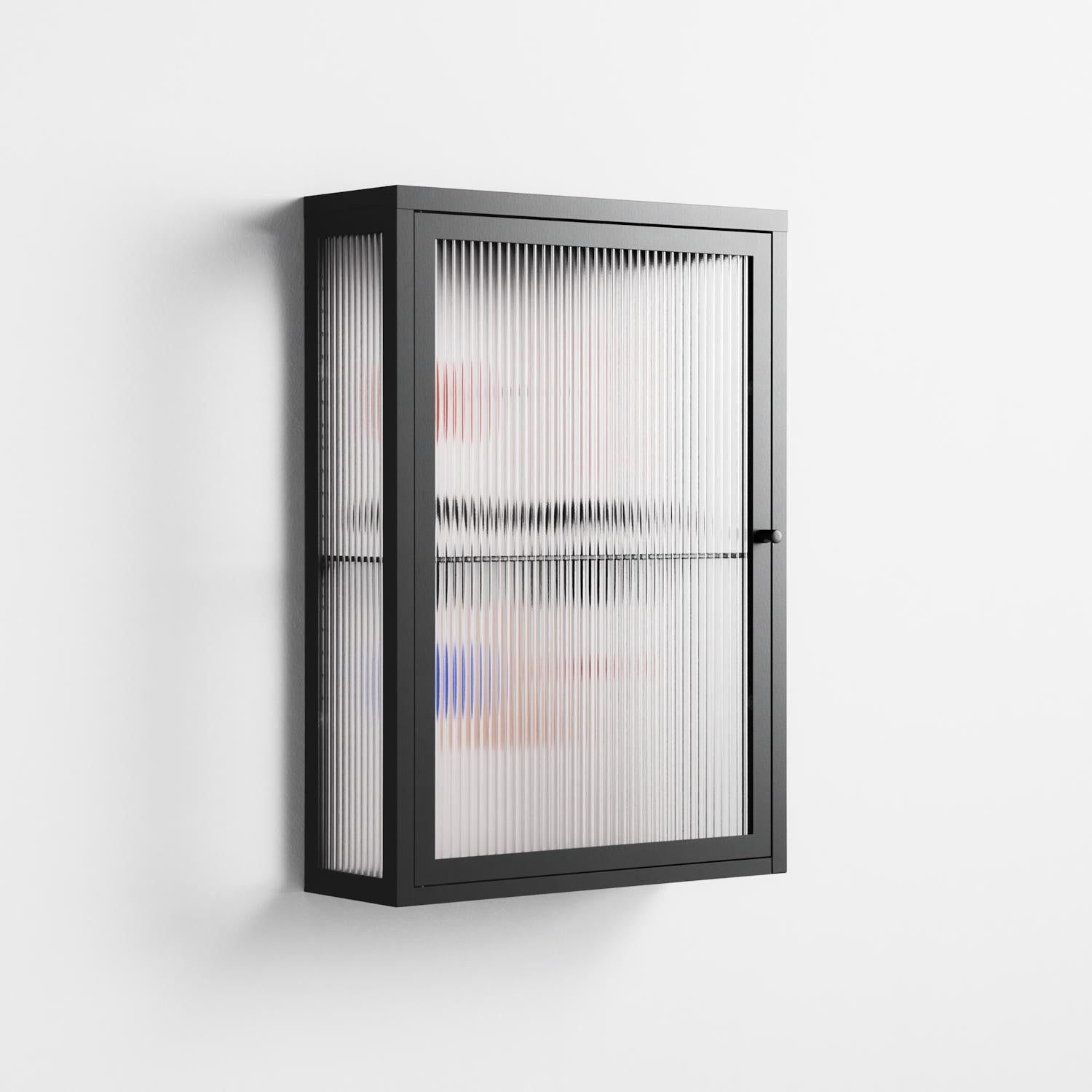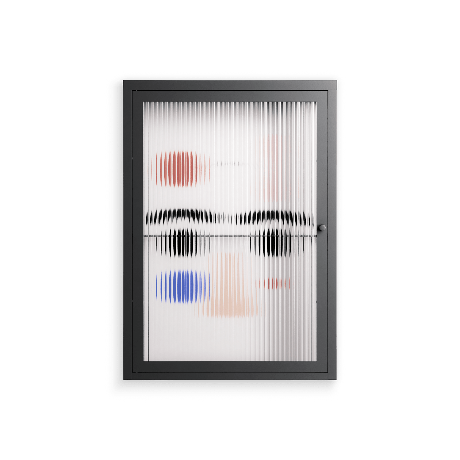 Équilibré by David Vanadia, displayed within the Vitrine Wall Cabinet behind Reeded glass. Finished in the colour Antracite, the cabinet becomes a frame for the artwork and the objects within.