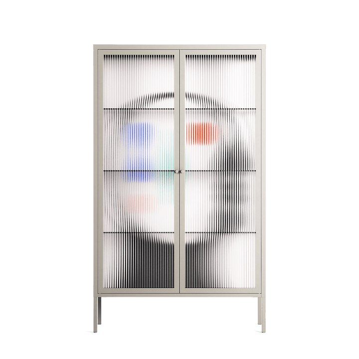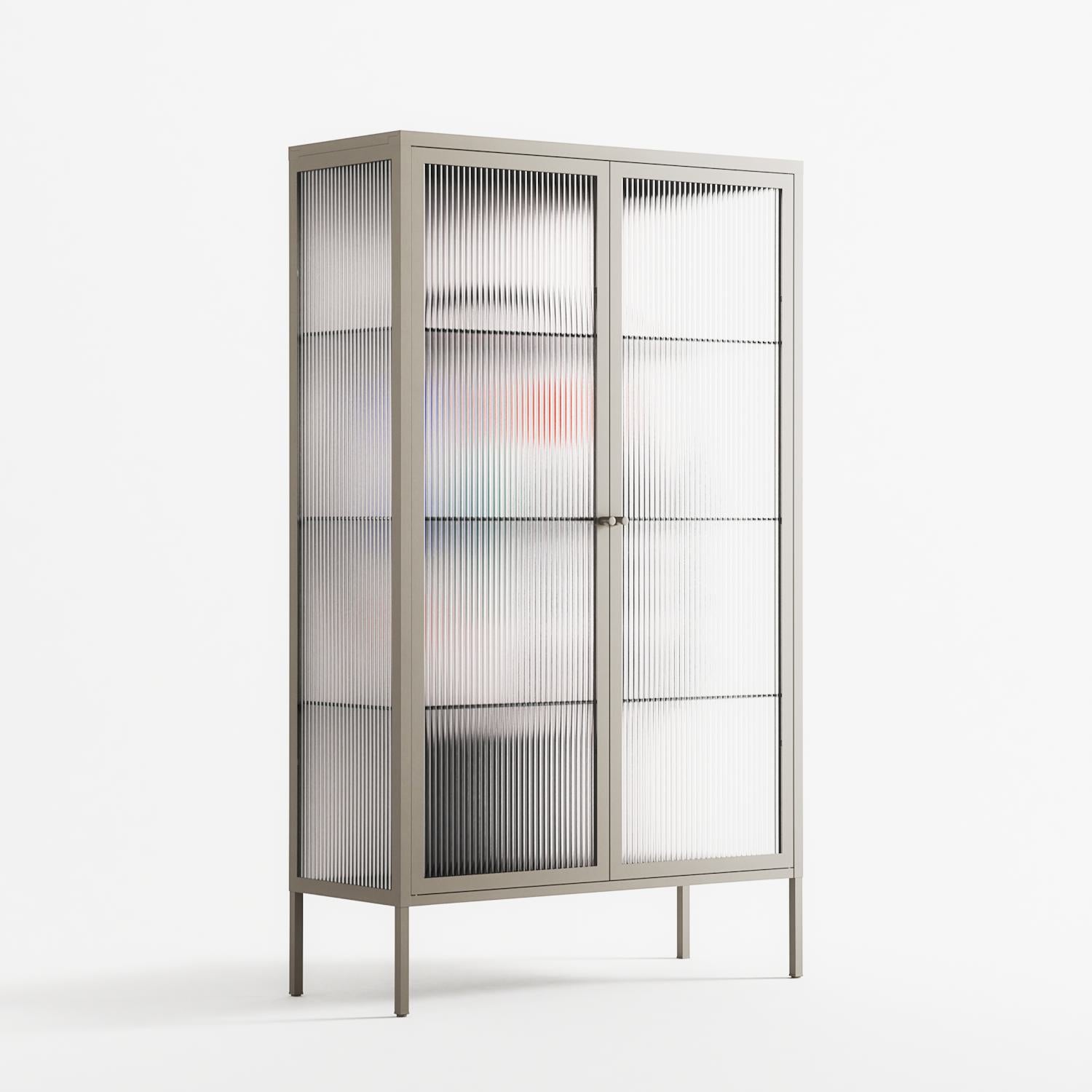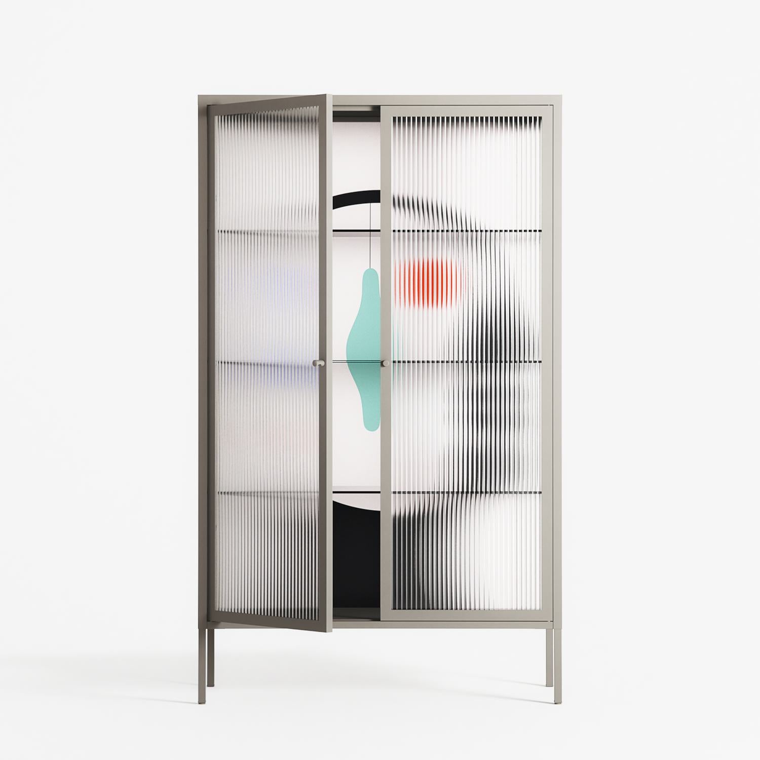 Équilibre_Intérieur by David Vanadia, displayed within the Vitrine Cabinet behind Reeded glass. Finished in the colour Pebble, the cabinet becomes a frame for the artwork and the objects within.