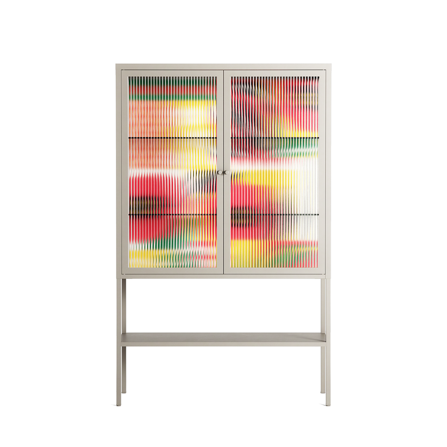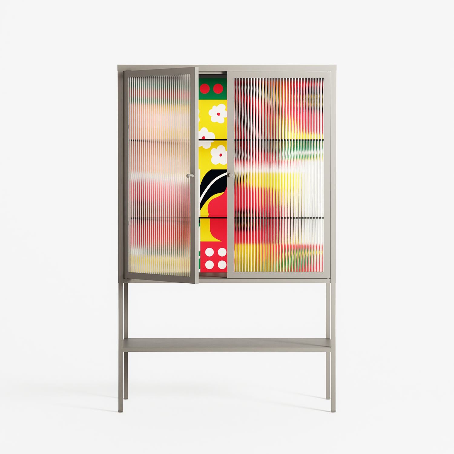 Flower C by Heather Zhou, displayed within the Vitrine Loft Cabinet behind Reeded glass. Finished in the colour Pebble, the cabinet becomes a frame for the artwork and the objects within.