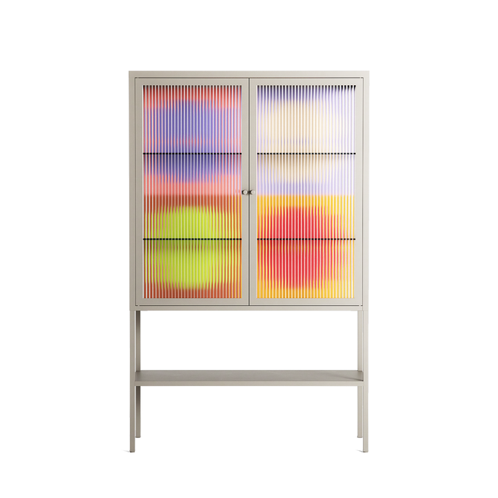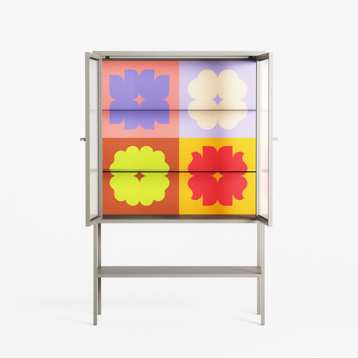 Flowers All by Linus Lohoff, displayed within the Vitrine Loft Cabinet behind Reeded glass. Finished in the colour Pebble, the cabinet becomes a frame for the artwork and the objects within.