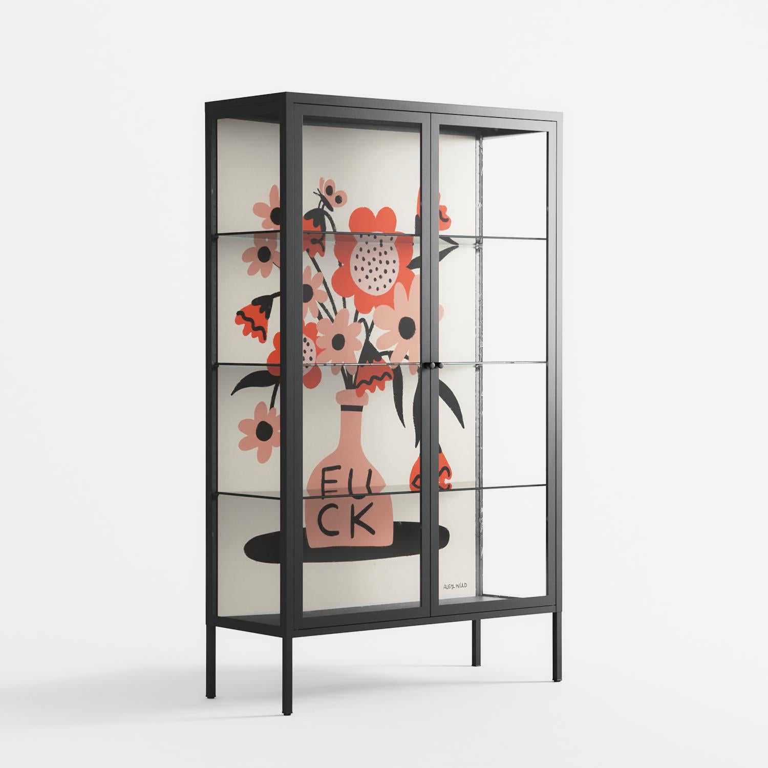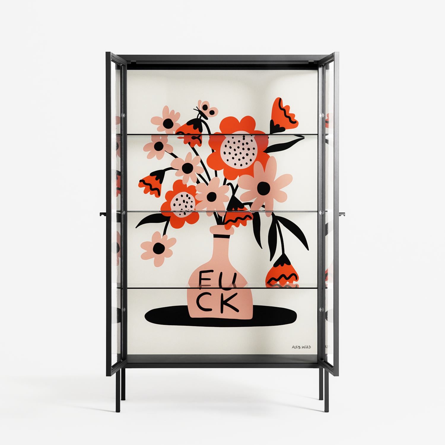 Fuck by Aley Wild, displayed within the Vitrine Cabinet behind Clear glass. Finished in the colour Antracite, the cabinet becomes a frame for the artwork and the objects within.