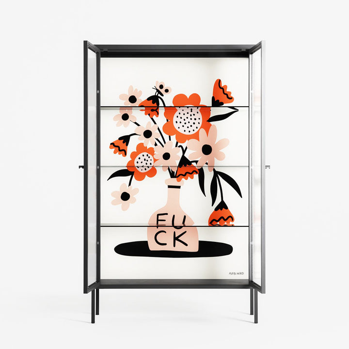 Fuck by Aley Wild, displayed within the Vitrine Cabinet behind Reeded glass. Finished in the colour Antracite, the cabinet becomes a frame for the artwork and the objects within.