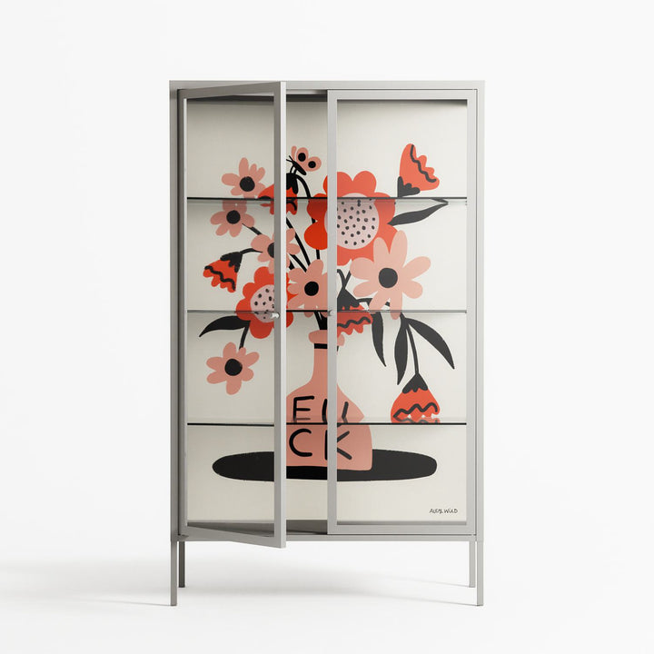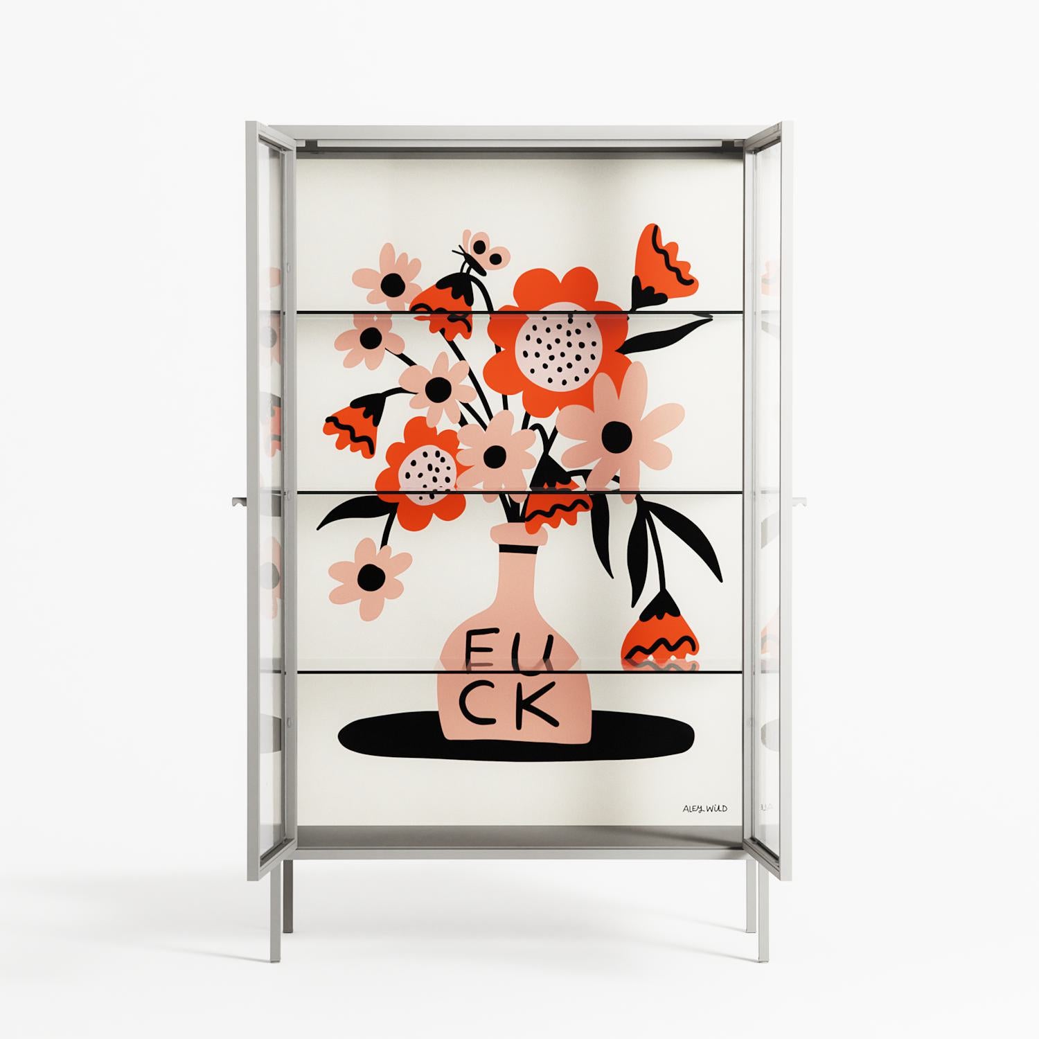 Fuck by Aley Wild, displayed within the Vitrine Cabinet behind Clear glass. Finished in the colour Chalk, the cabinet becomes a frame for the artwork and the objects within.