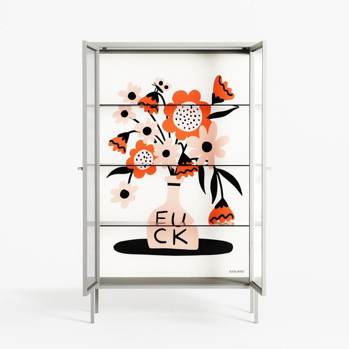 Fuck by Aley Wild, displayed within the Vitrine Cabinet behind Reeded glass. Finished in the colour Chalk, the cabinet becomes a frame for the artwork and the objects within.