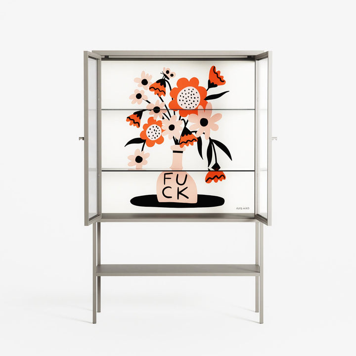 Fuck by Aley Wild, displayed within the Vitrine Loft Cabinet behind Reeded glass. Finished in the colour Pebble, the cabinet becomes a frame for the artwork and the objects within.