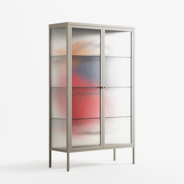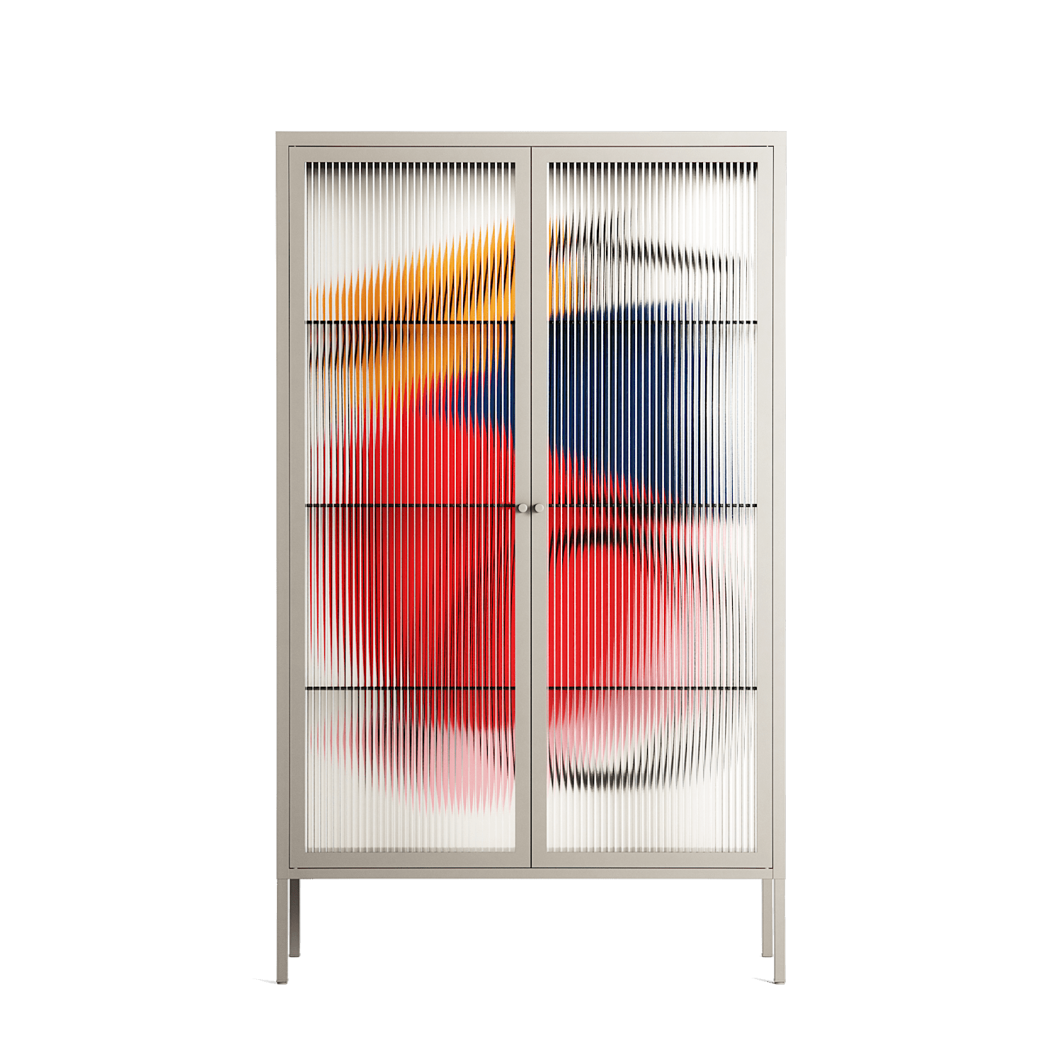 Fuerte by Vratislav Pecka, displayed within the Vitrine Cabinet behind Reeded glass. Finished in the colour Pebble, the cabinet becomes a frame for the artwork and the objects within.