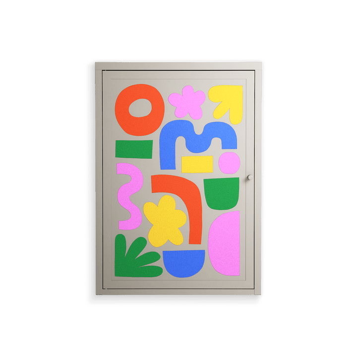 Fun Shapes by Sandra Hutter, artistically portrayed on the Vitrine Wall Cabinet. Finished in the colour Pebble, the cabinet blends artwork and object together.