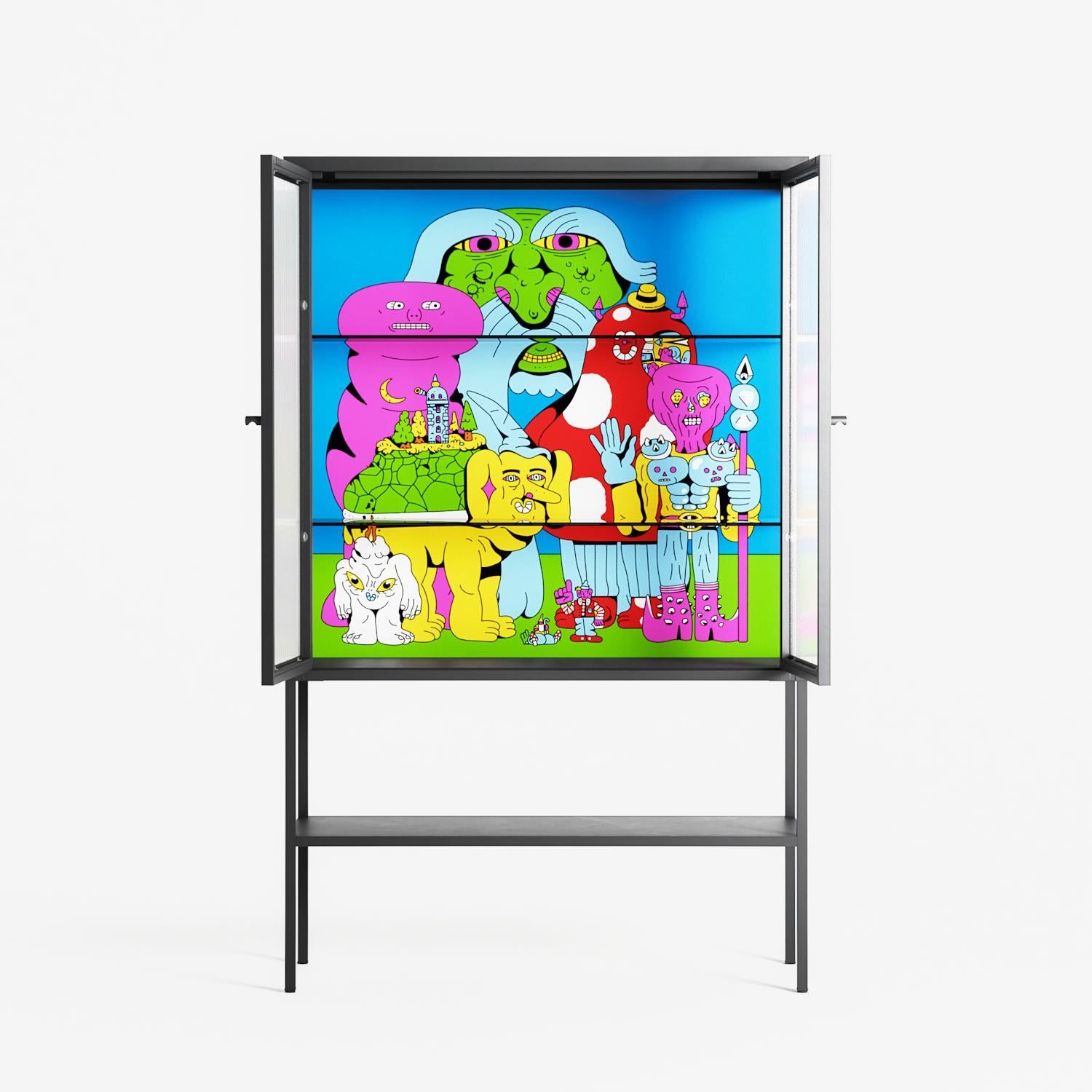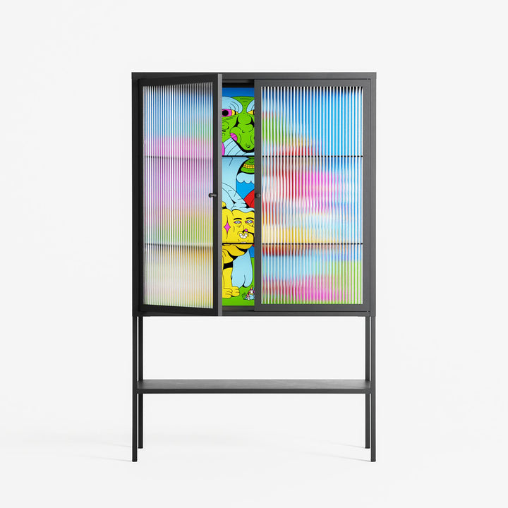 Funny Friends by Cezar Berje, displayed within the Vitrine Loft Cabinet behind Reeded glass. Finished in the colour Antracite, the cabinet becomes a frame for the artwork and the objects within.