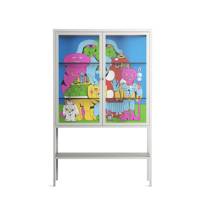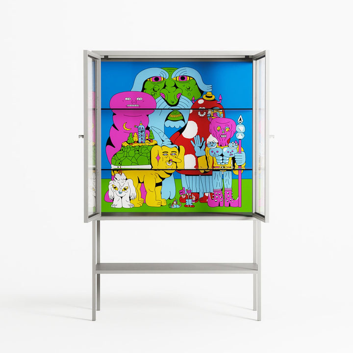 Funny Friends by Cezar Berje, displayed within the Vitrine Loft Cabinet behind Clear glass. Finished in the colour Chalk, the cabinet becomes a frame for the artwork and the objects within.