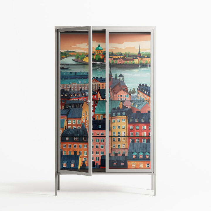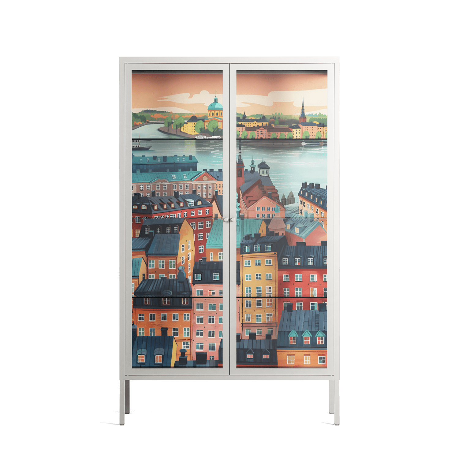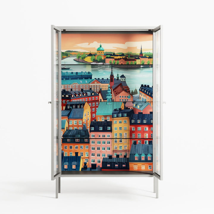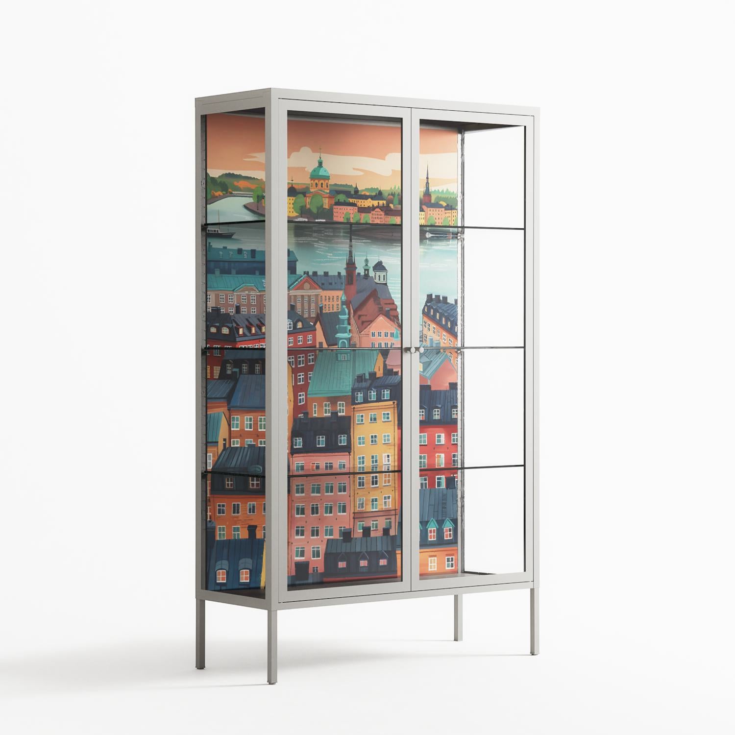 Gamla Stan by Nur Rydberg, displayed within the Vitrine Cabinet behind Clear glass. Finished in the colour Chalk, the cabinet becomes a frame for the artwork and the objects within.
