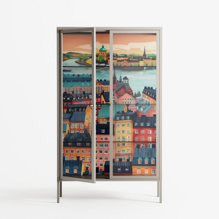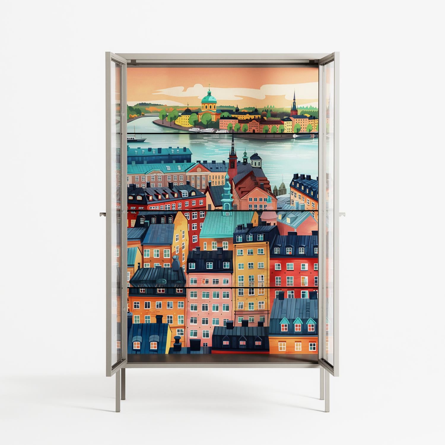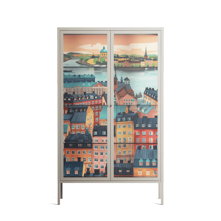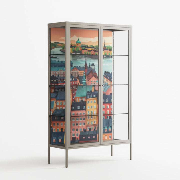 Gamla Stan by Nur Rydberg, displayed within the Vitrine Cabinet behind Clear glass. Finished in the colour Pebble, the cabinet becomes a frame for the artwork and the objects within.