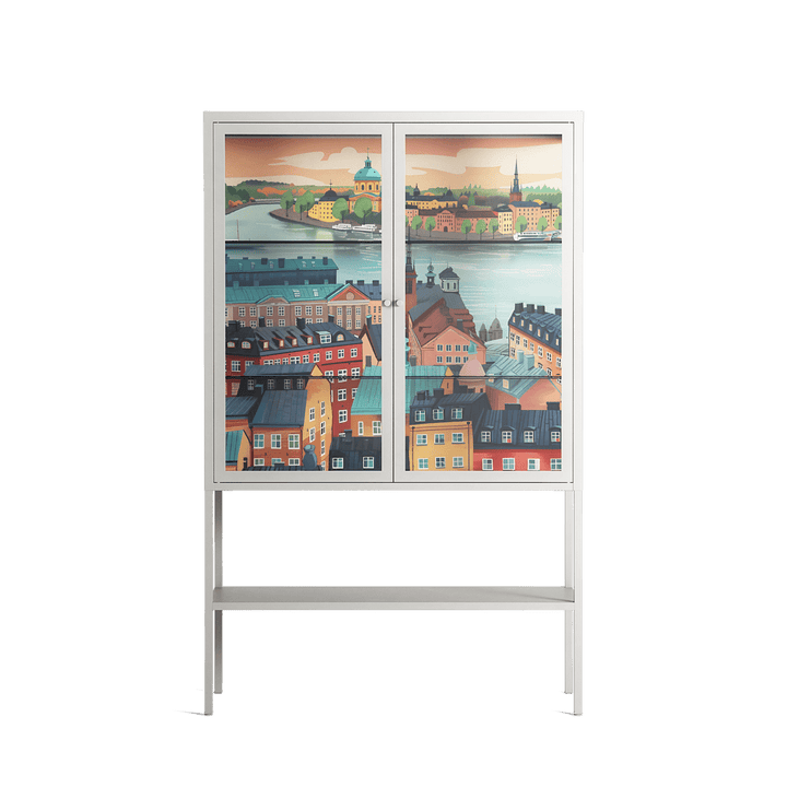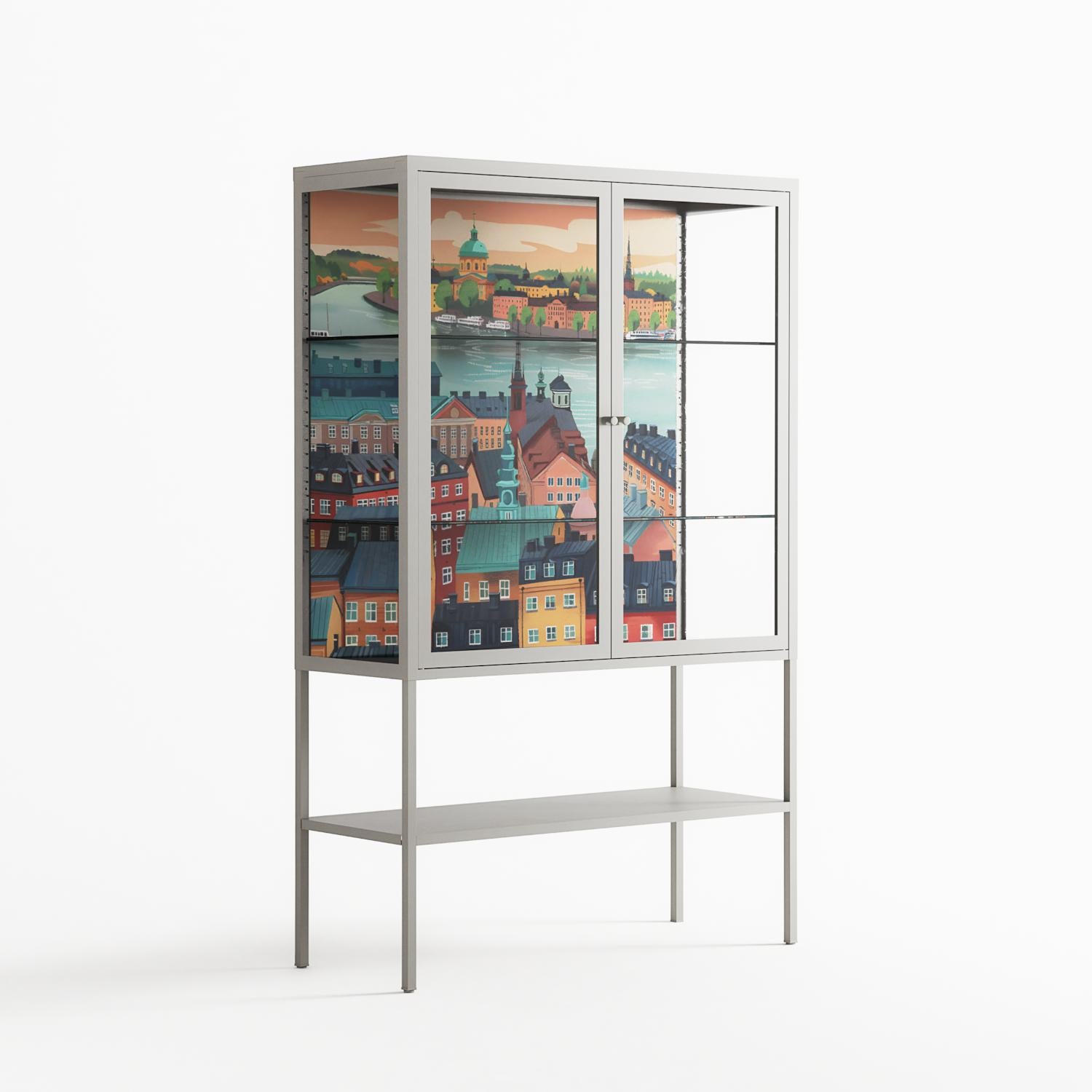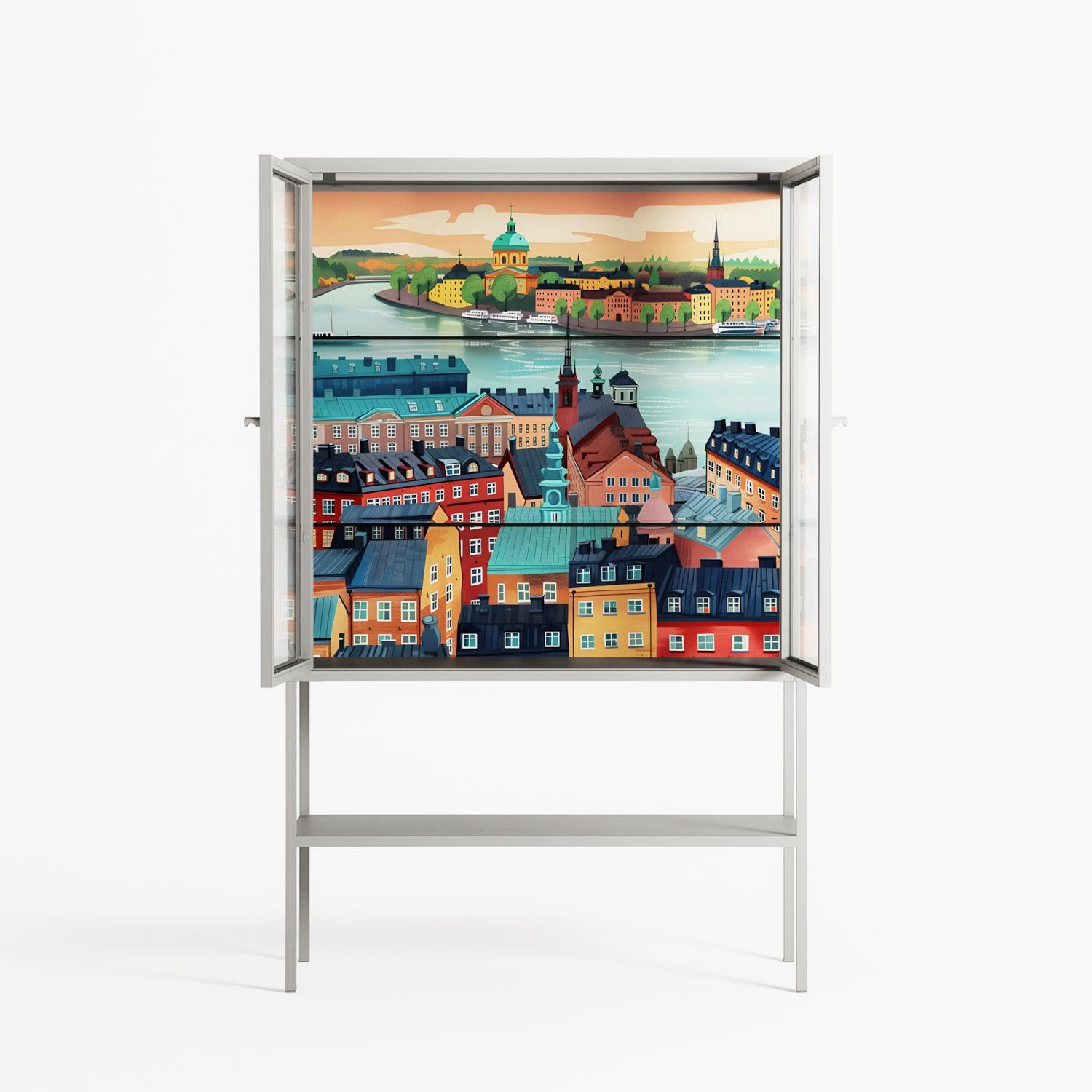 Gamla Stan by Nur Rydberg, displayed within the Vitrine Loft Cabinet behind Clear glass. Finished in the colour Chalk, the cabinet becomes a frame for the artwork and the objects within.