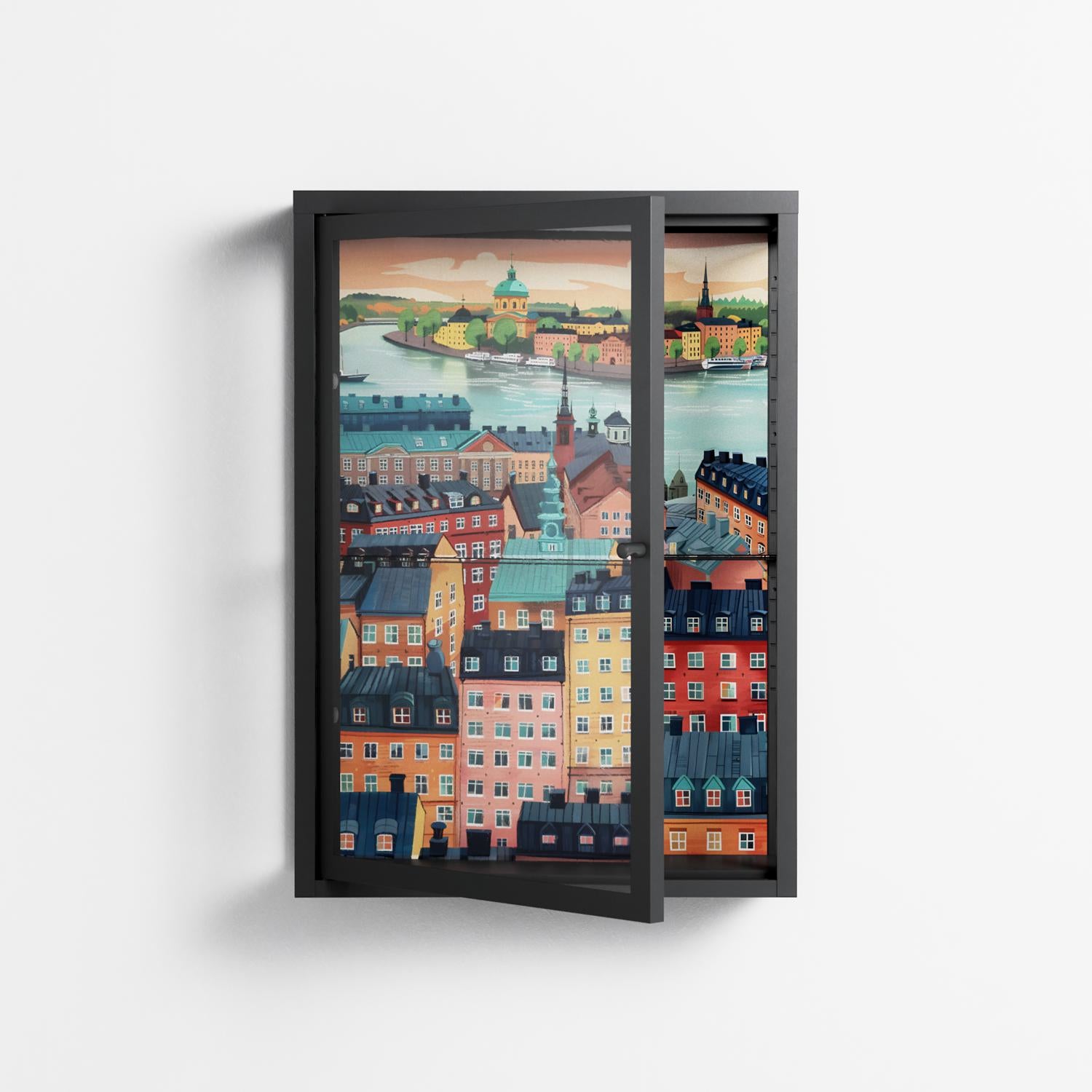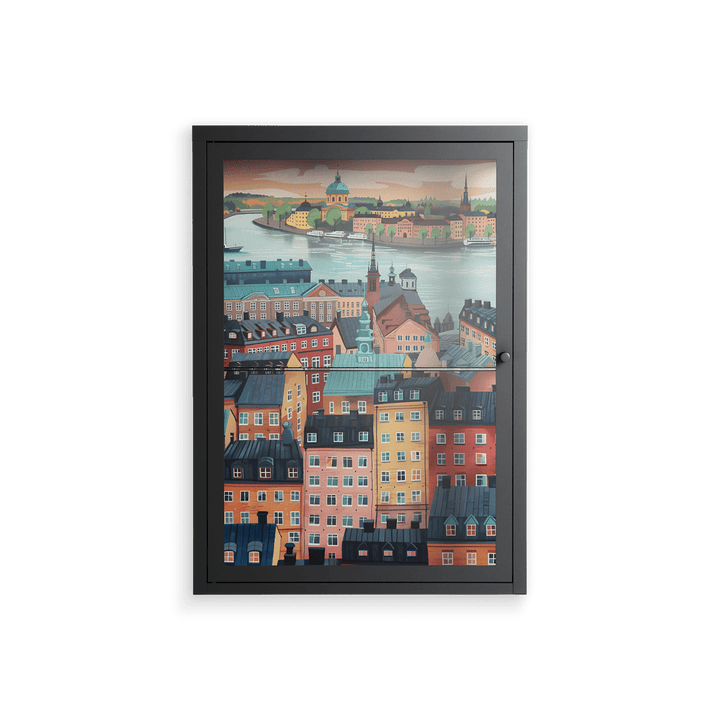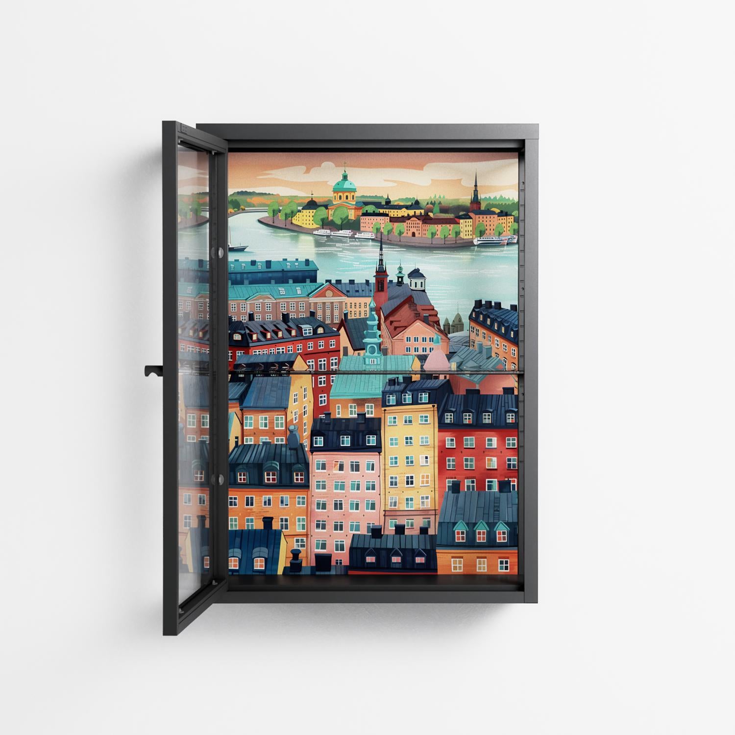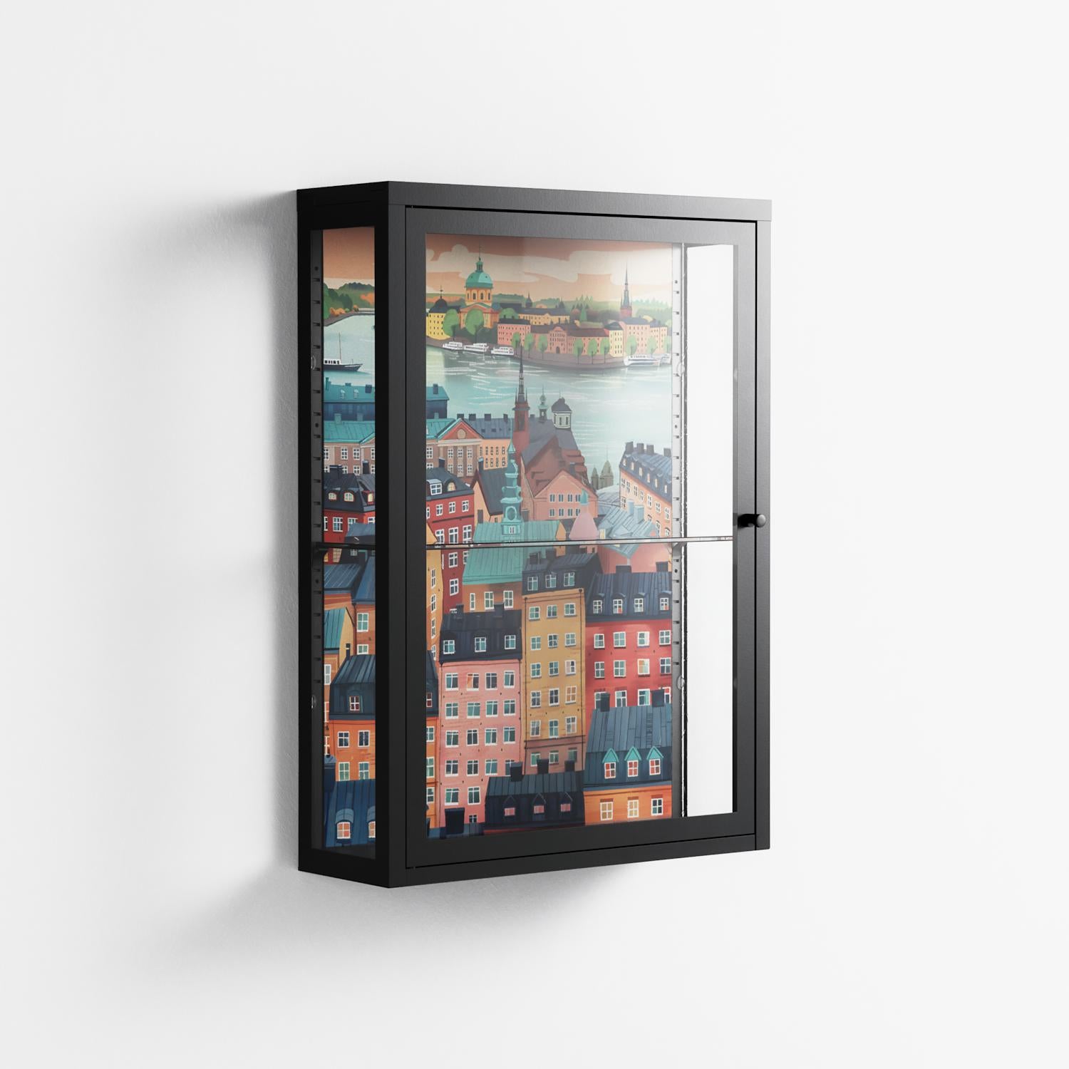 Gamla Stan by Nur Rydberg, displayed within the Vitrine Wall Cabinet behind Clear glass. Finished in the colour Antracite, the cabinet becomes a frame for the artwork and the objects within.