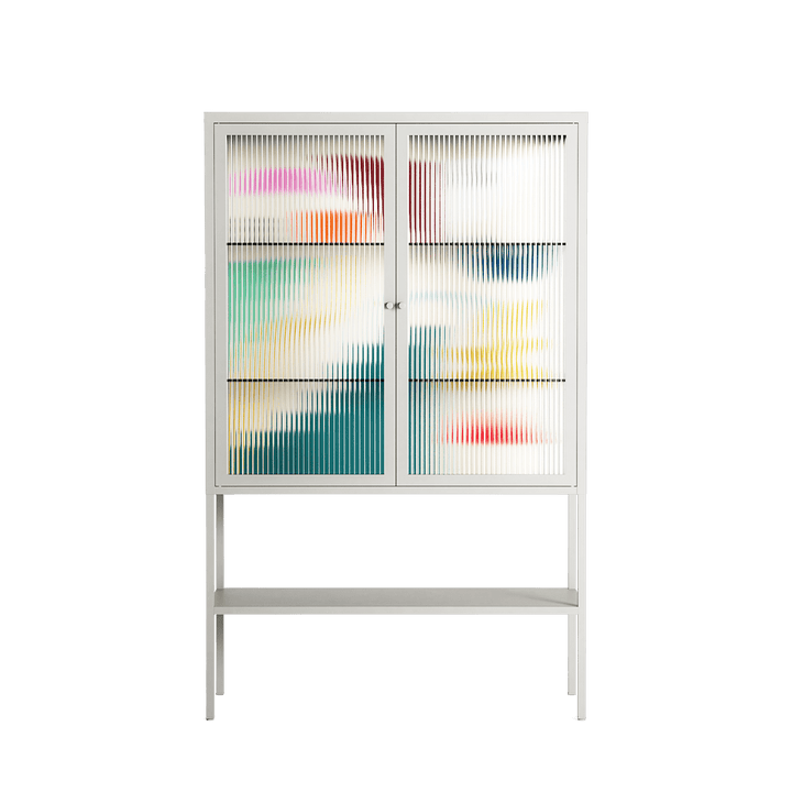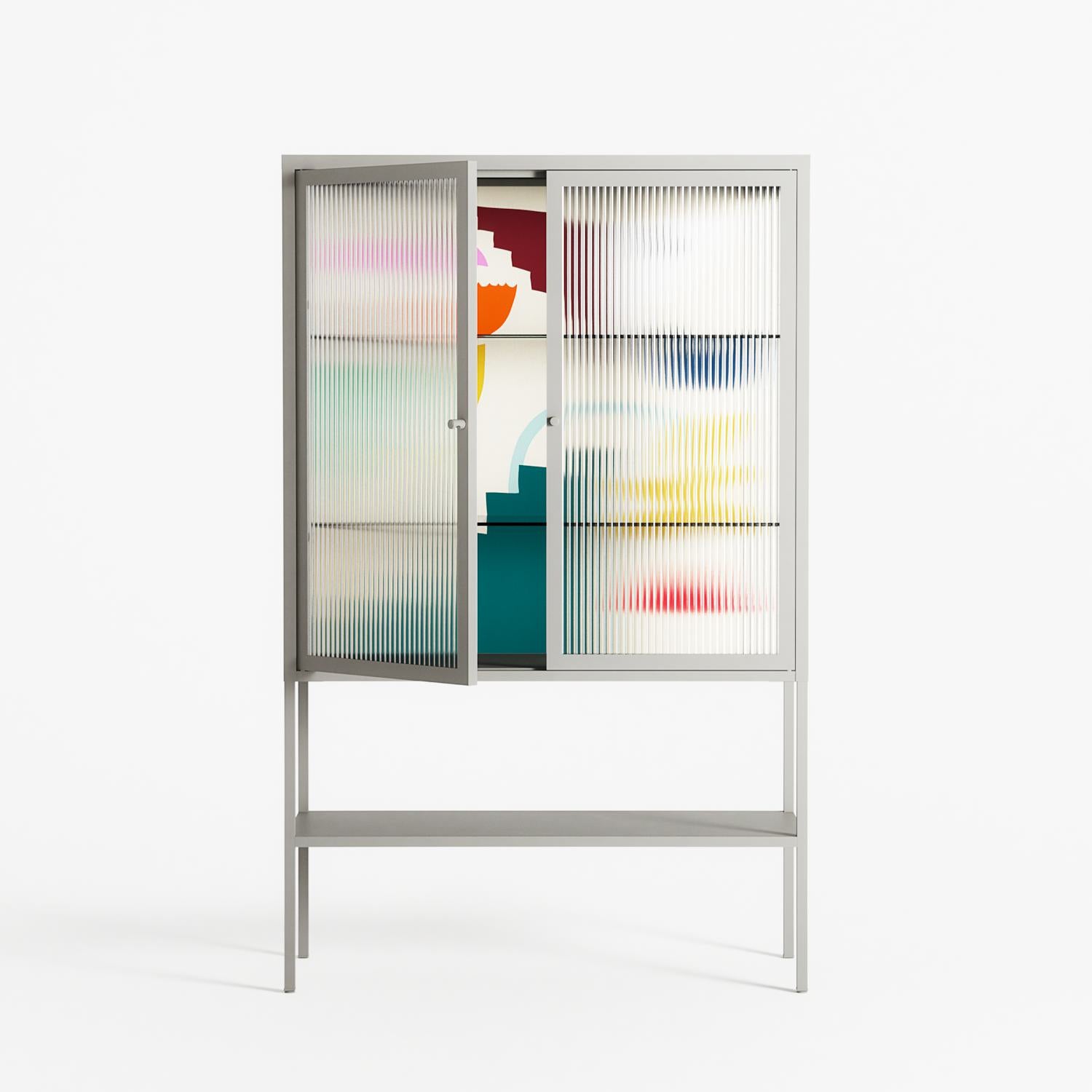 Garden Shapes by Aley Wild, displayed within the Vitrine Loft Cabinet behind Reeded glass. Finished in the colour Chalk, the cabinet becomes a frame for the artwork and the objects within.