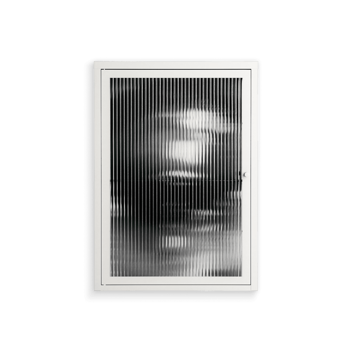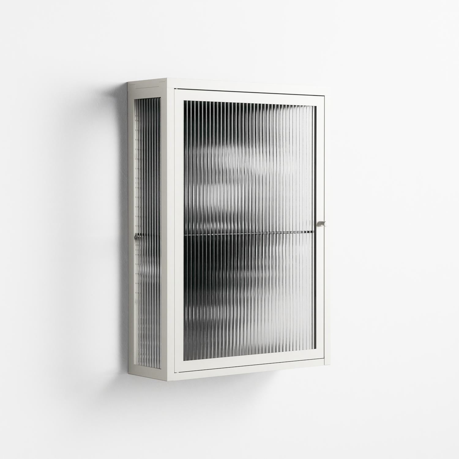 Gel by Nadia Ryder, displayed within the Vitrine Wall Cabinet behind Reeded glass. Finished in the colour Chalk, the cabinet becomes a frame for the artwork and the objects within.