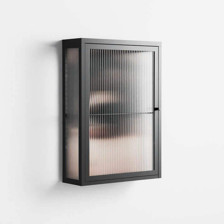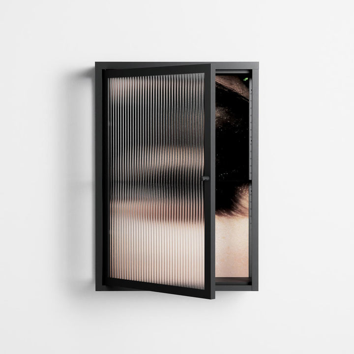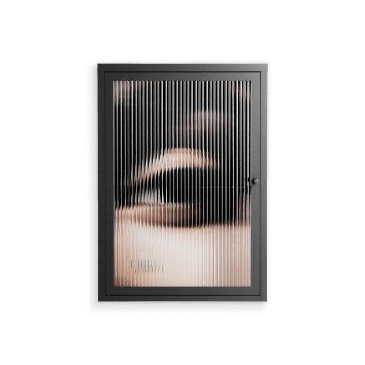 Gem by Nadia Ryder, displayed within the Vitrine Wall Cabinet behind Reeded glass. Finished in the colour Antracite, the cabinet becomes a frame for the artwork and the objects within.