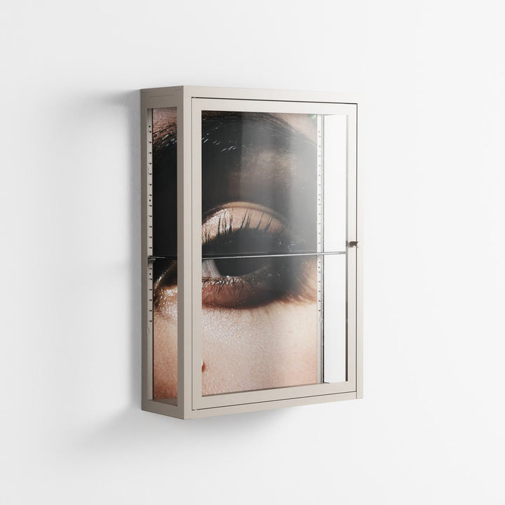 Gem by Nadia Ryder, displayed within the Vitrine Wall Cabinet behind Clear glass. Finished in the colour Pebble, the cabinet becomes a frame for the artwork and the objects within.