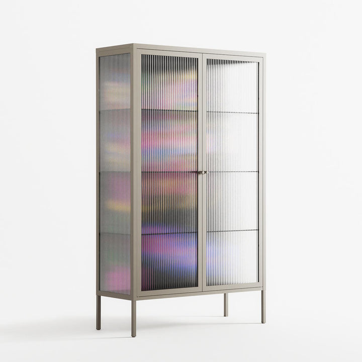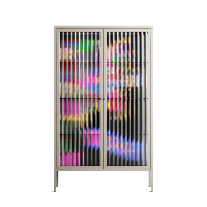 Gentleman by Cezar Berje, displayed within the Vitrine Cabinet behind Reeded glass. Finished in the colour Pebble, the cabinet becomes a frame for the artwork and the objects within.