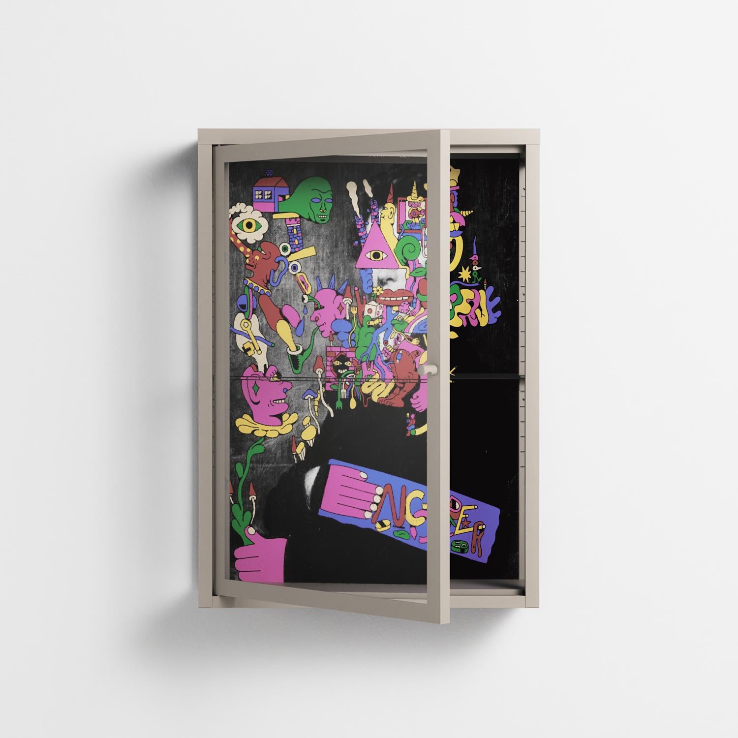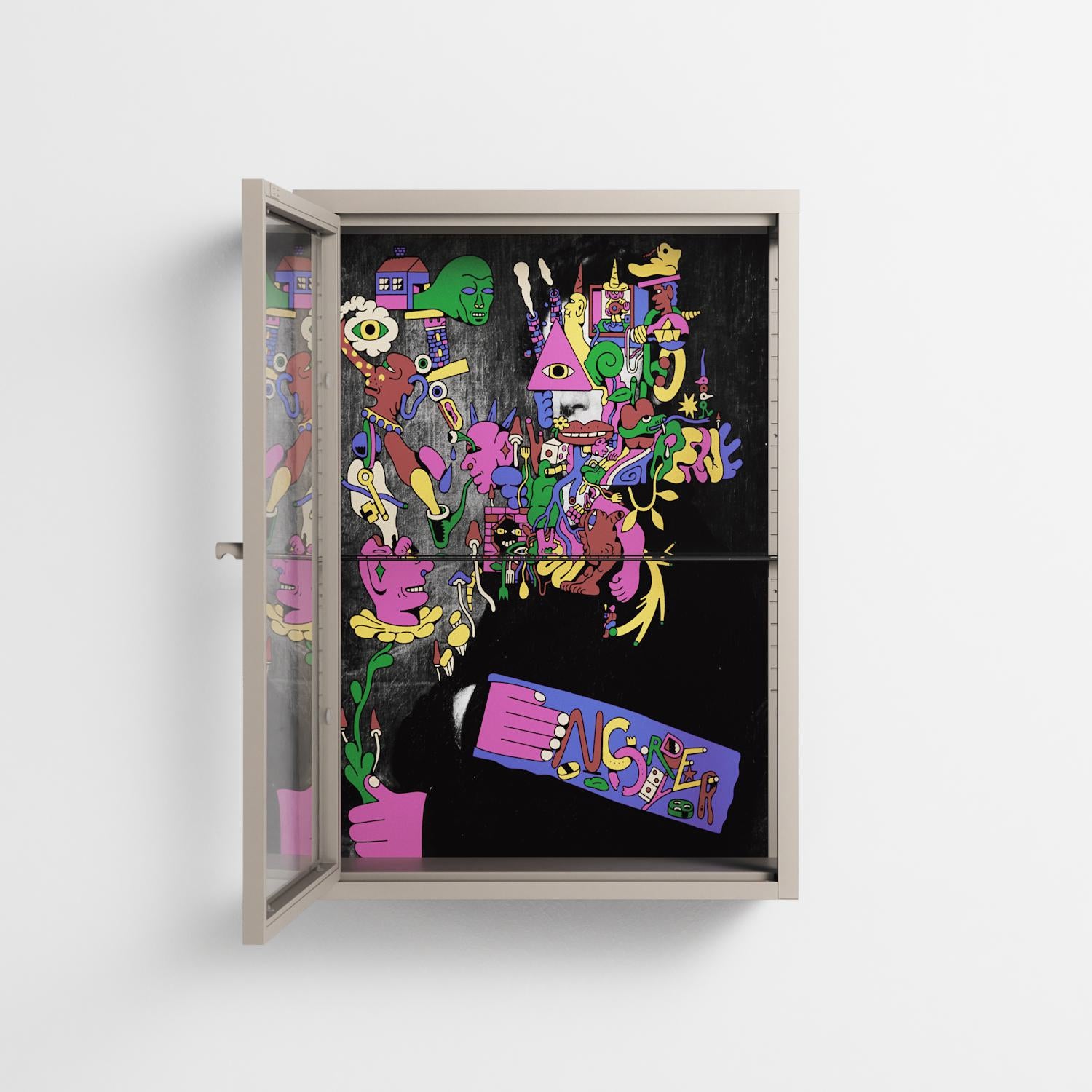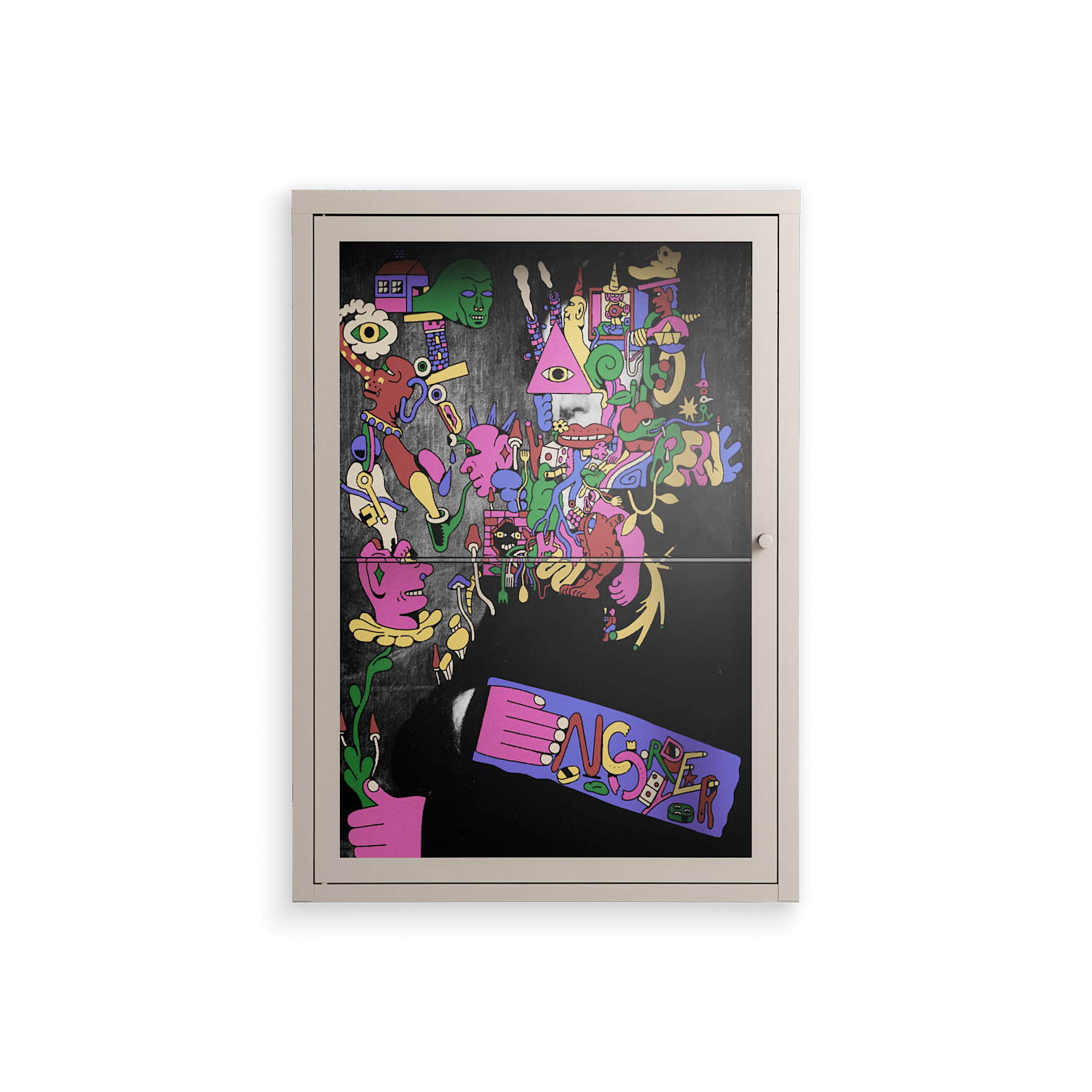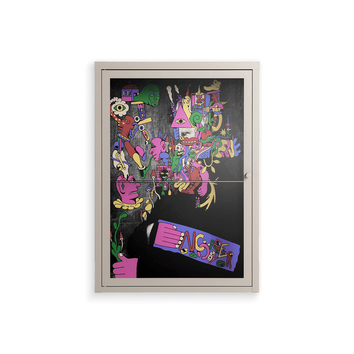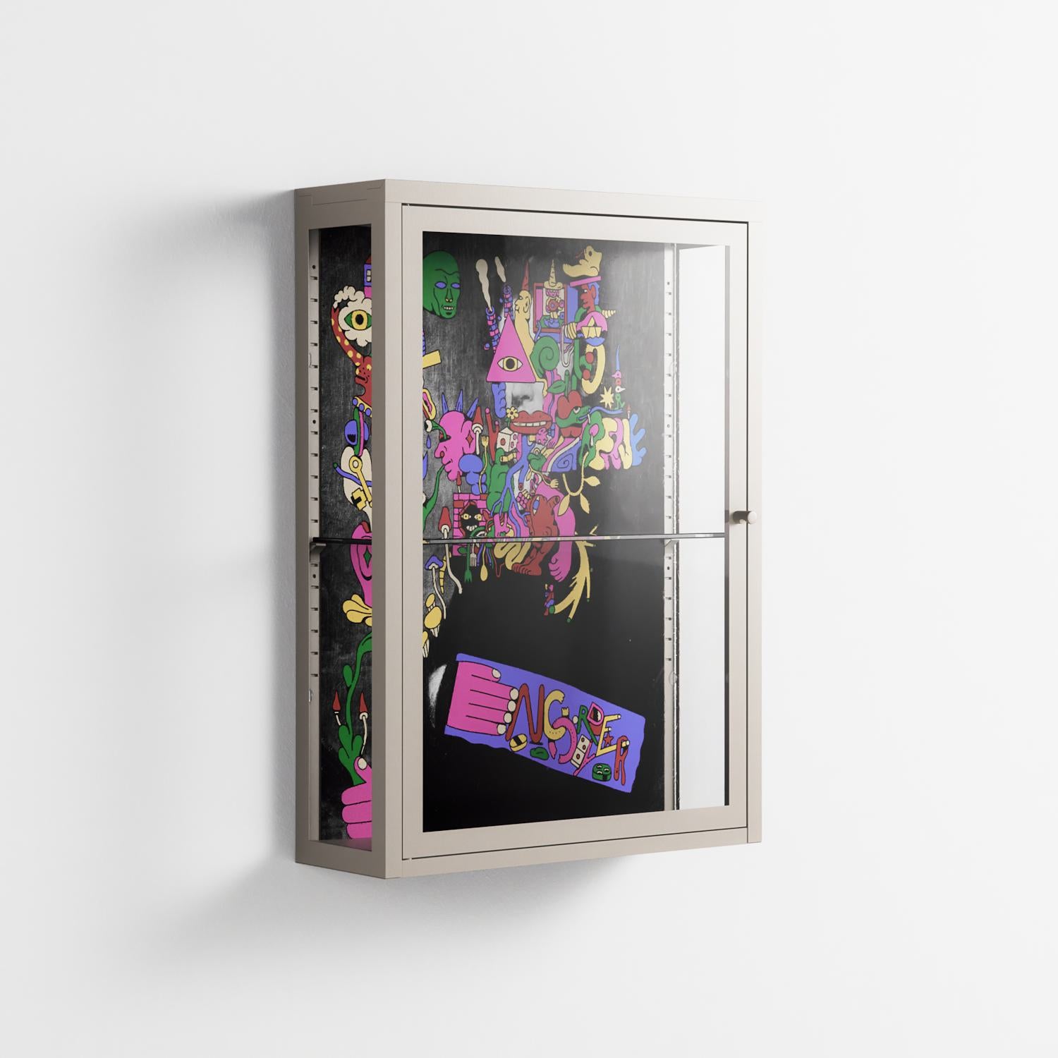 Vitrine pairs artworks by artists, designers, and creatives from around the world with a frame that elevates and displays them in everyday space. The cabinet is built from precision-cut metal with a powder-coated finish — resistant to wear and crafted for stability — making it ideal for both office and home spaces.