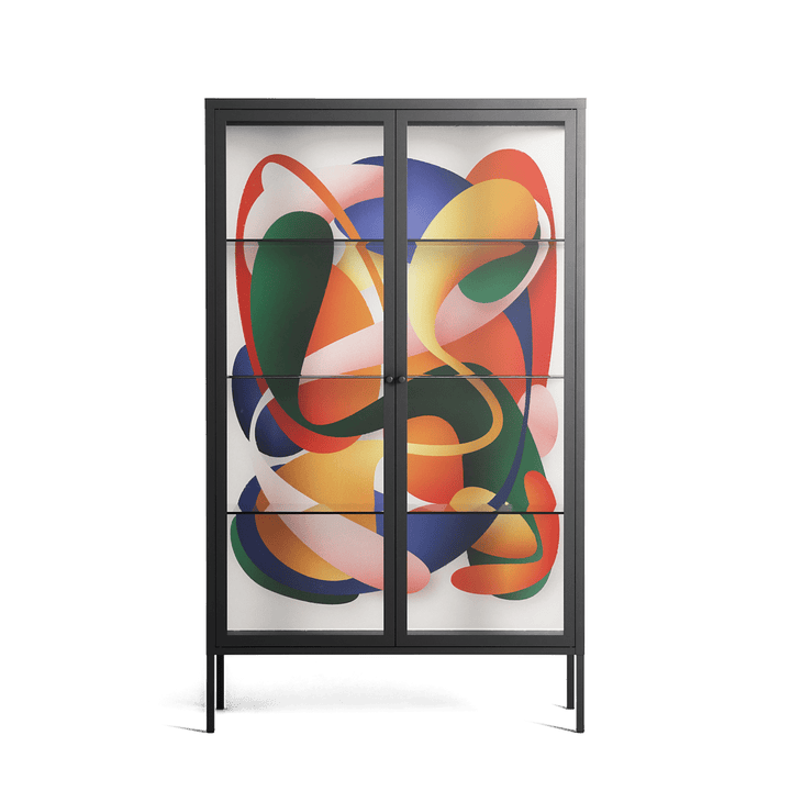 Gloss by Vratislav Pecka, displayed within the Vitrine Cabinet behind Clear glass. Finished in the colour Antracite, the cabinet becomes a frame for the artwork and the objects within.