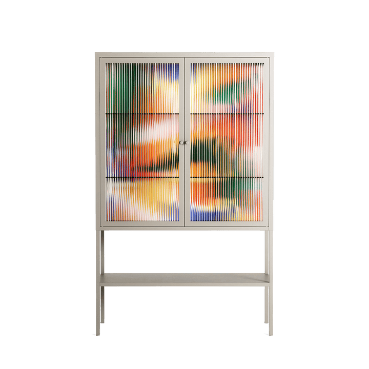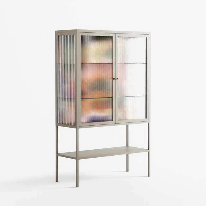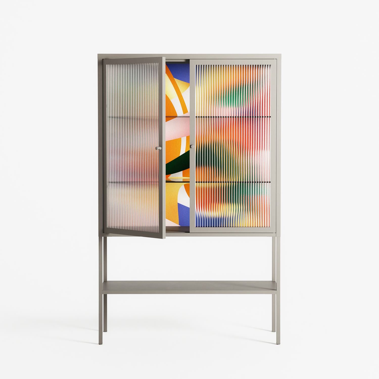 Gloss by Vratislav Pecka, displayed within the Vitrine Loft Cabinet behind Reeded glass. Finished in the colour Pebble, the cabinet becomes a frame for the artwork and the objects within.