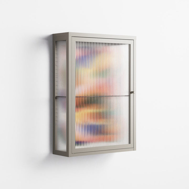 Gloss by Vratislav Pecka, displayed within the Vitrine Wall Cabinet behind Reeded glass. Finished in the colour Pebble, the cabinet becomes a frame for the artwork and the objects within.