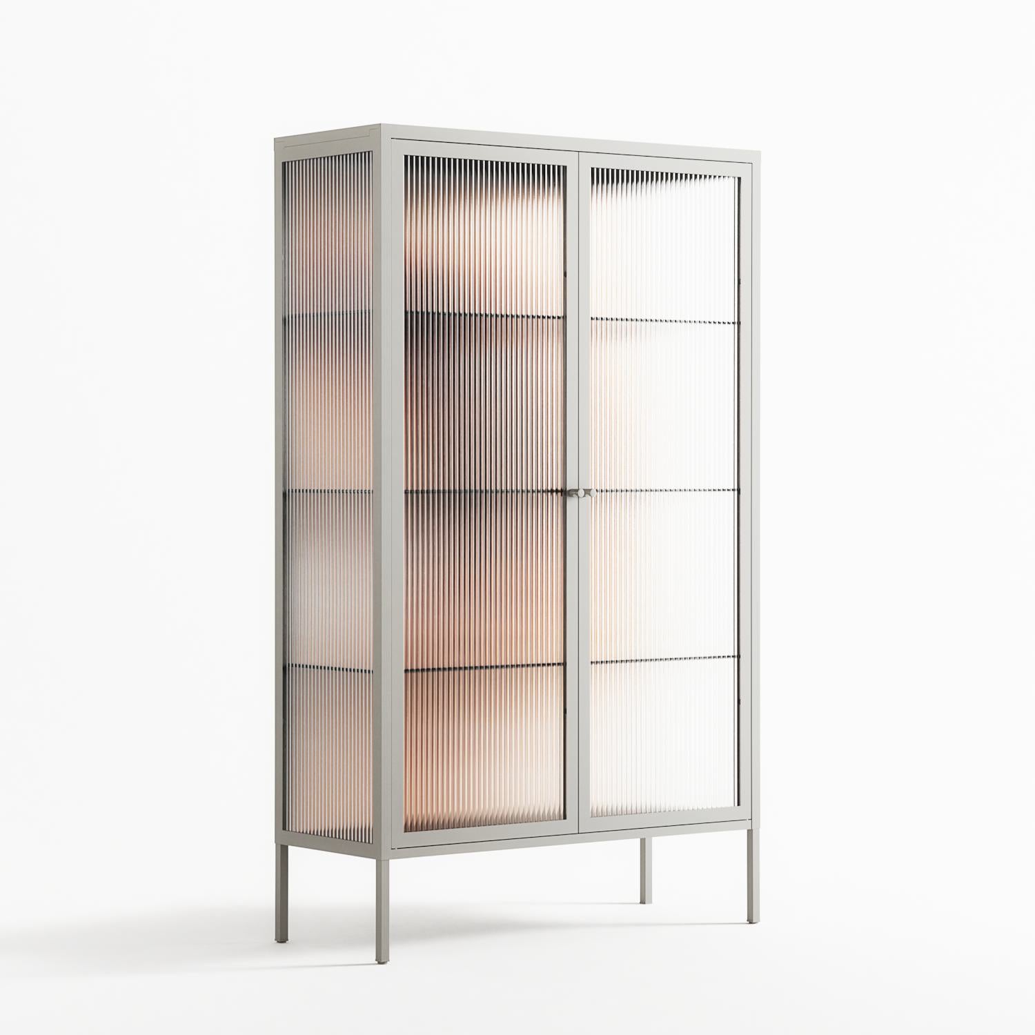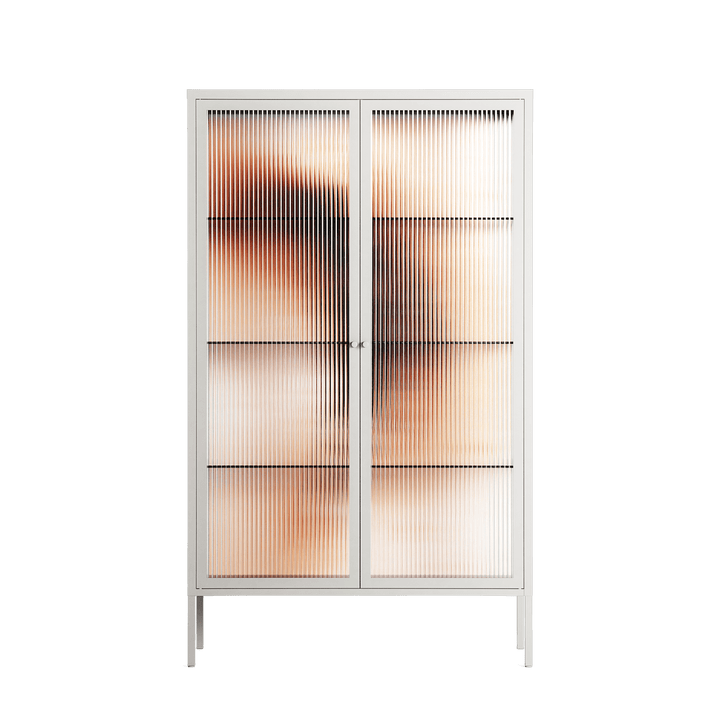 Glow by Nadia Ryder, displayed within the Vitrine Cabinet behind Reeded glass. Finished in the colour Chalk, the cabinet becomes a frame for the artwork and the objects within.