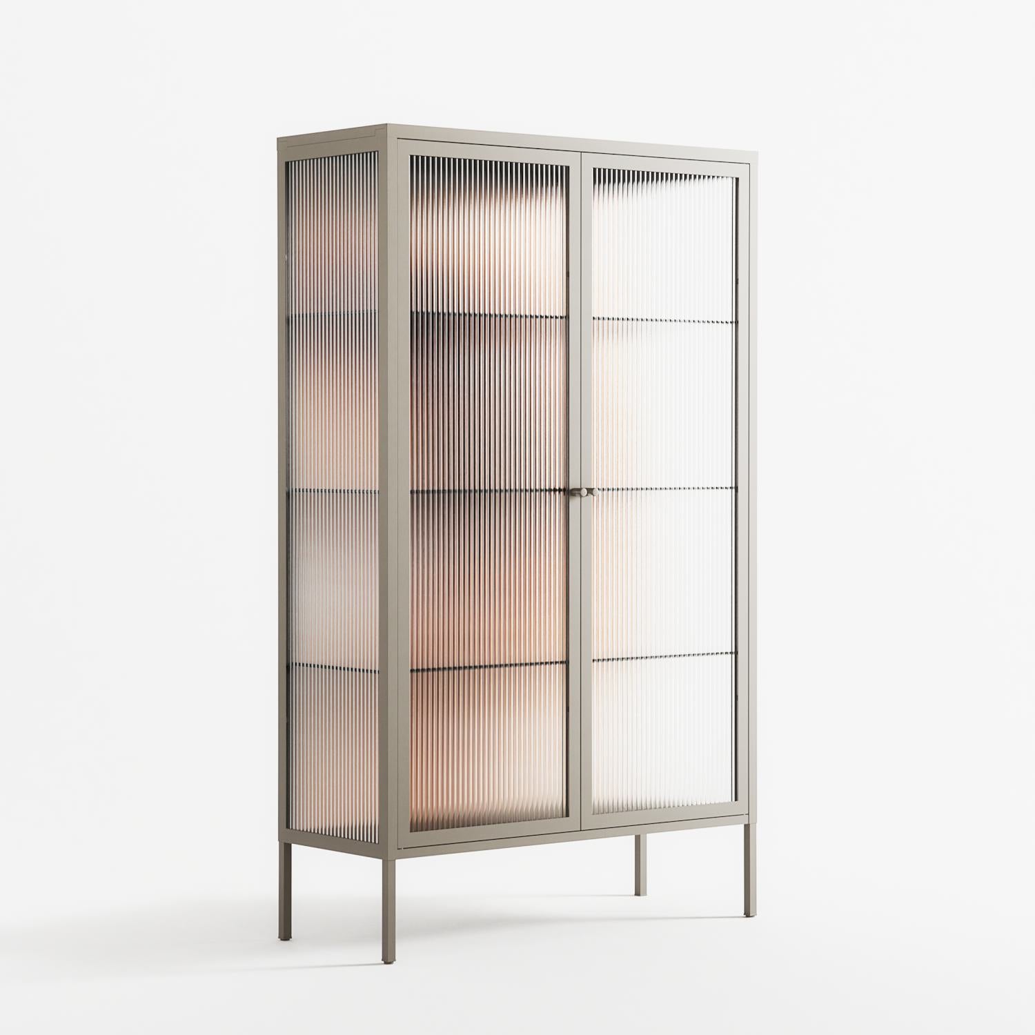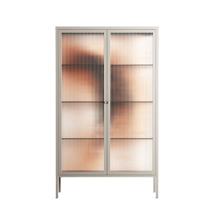 Glow by Nadia Ryder, displayed within the Vitrine Cabinet behind Reeded glass. Finished in the colour Pebble, the cabinet becomes a frame for the artwork and the objects within.