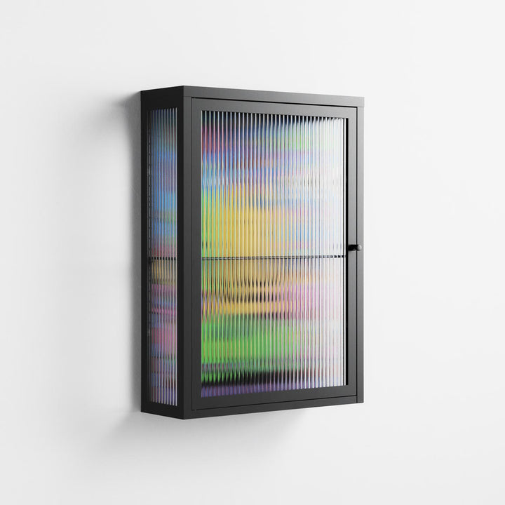 Go Slow by Cezar Berje, displayed within the Vitrine Wall Cabinet behind Reeded glass. Finished in the colour Antracite, the cabinet becomes a frame for the artwork and the objects within.