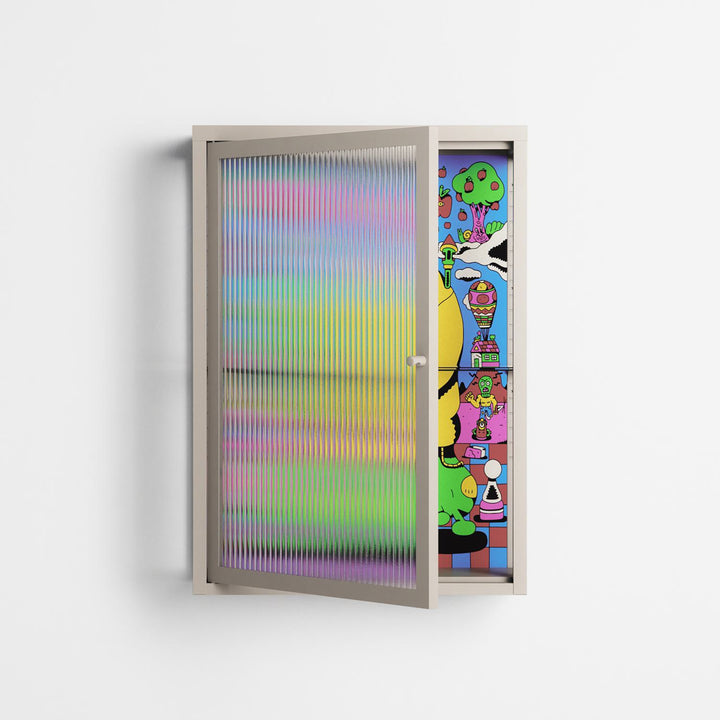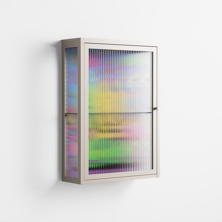 Go Slow by Cezar Berje, displayed within the Vitrine Wall Cabinet behind Reeded glass. Finished in the colour Pebble, the cabinet becomes a frame for the artwork and the objects within.