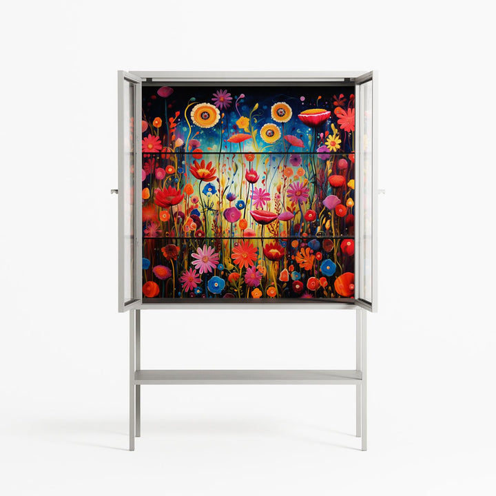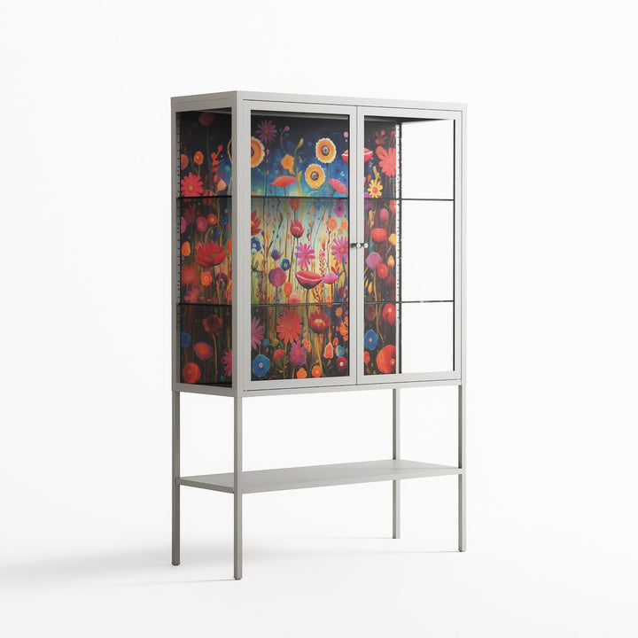 Greatful Meadow by Nur Rydberg, displayed within the Vitrine Loft Cabinet behind Clear glass. Finished in the colour Chalk, the cabinet becomes a frame for the artwork and the objects within.
