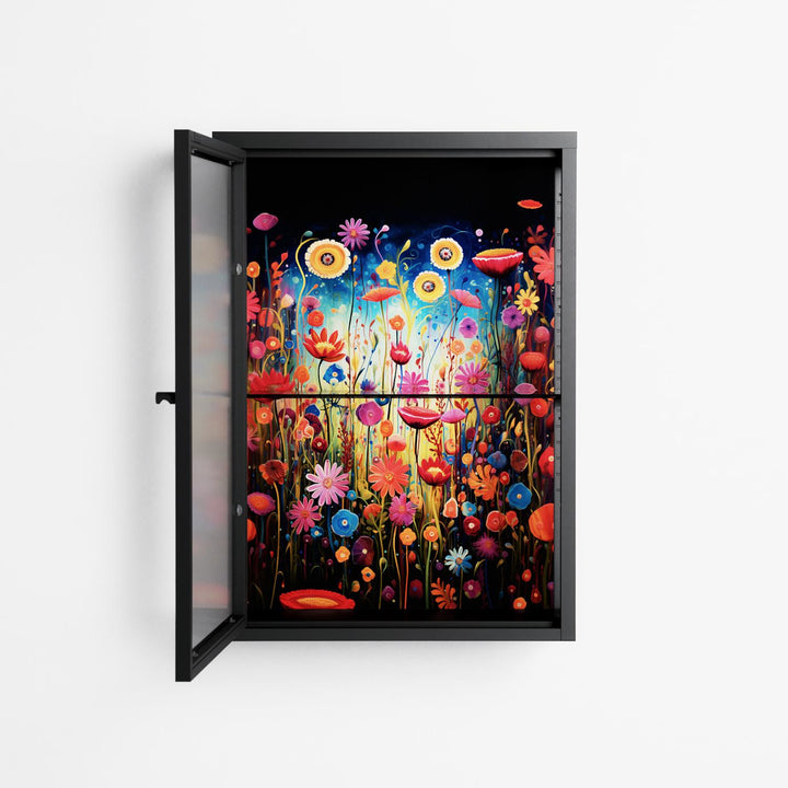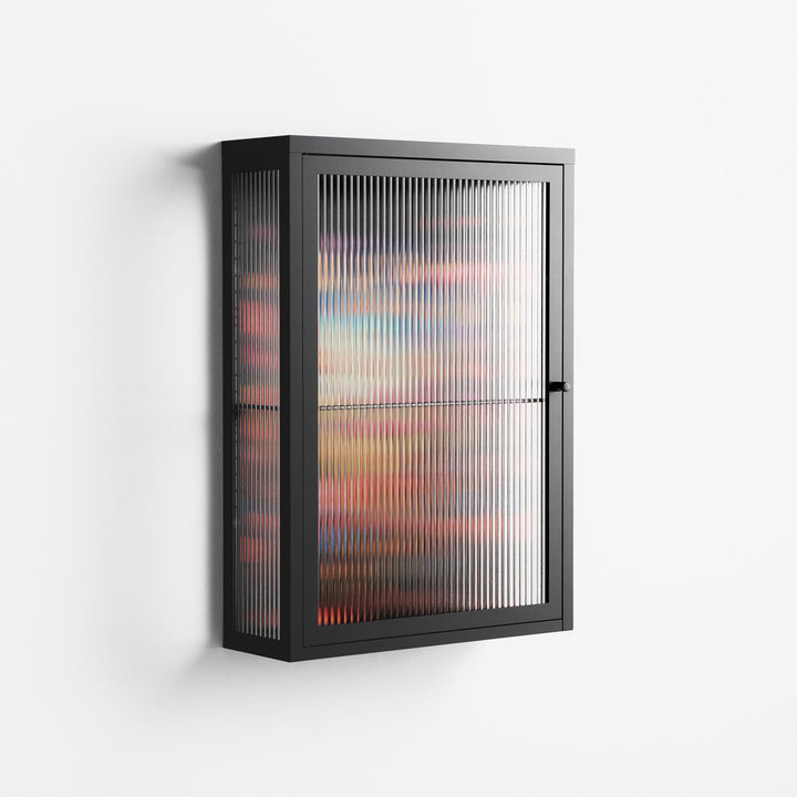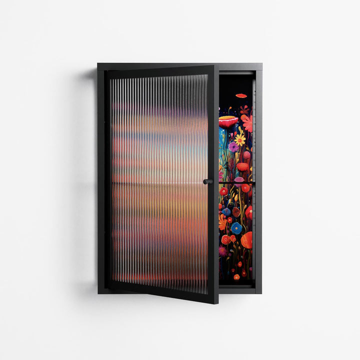 Greatful Meadow by Nur Rydberg, displayed within the Vitrine Wall Cabinet behind Reeded glass. Finished in the colour Antracite, the cabinet becomes a frame for the artwork and the objects within.