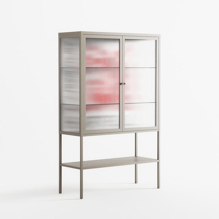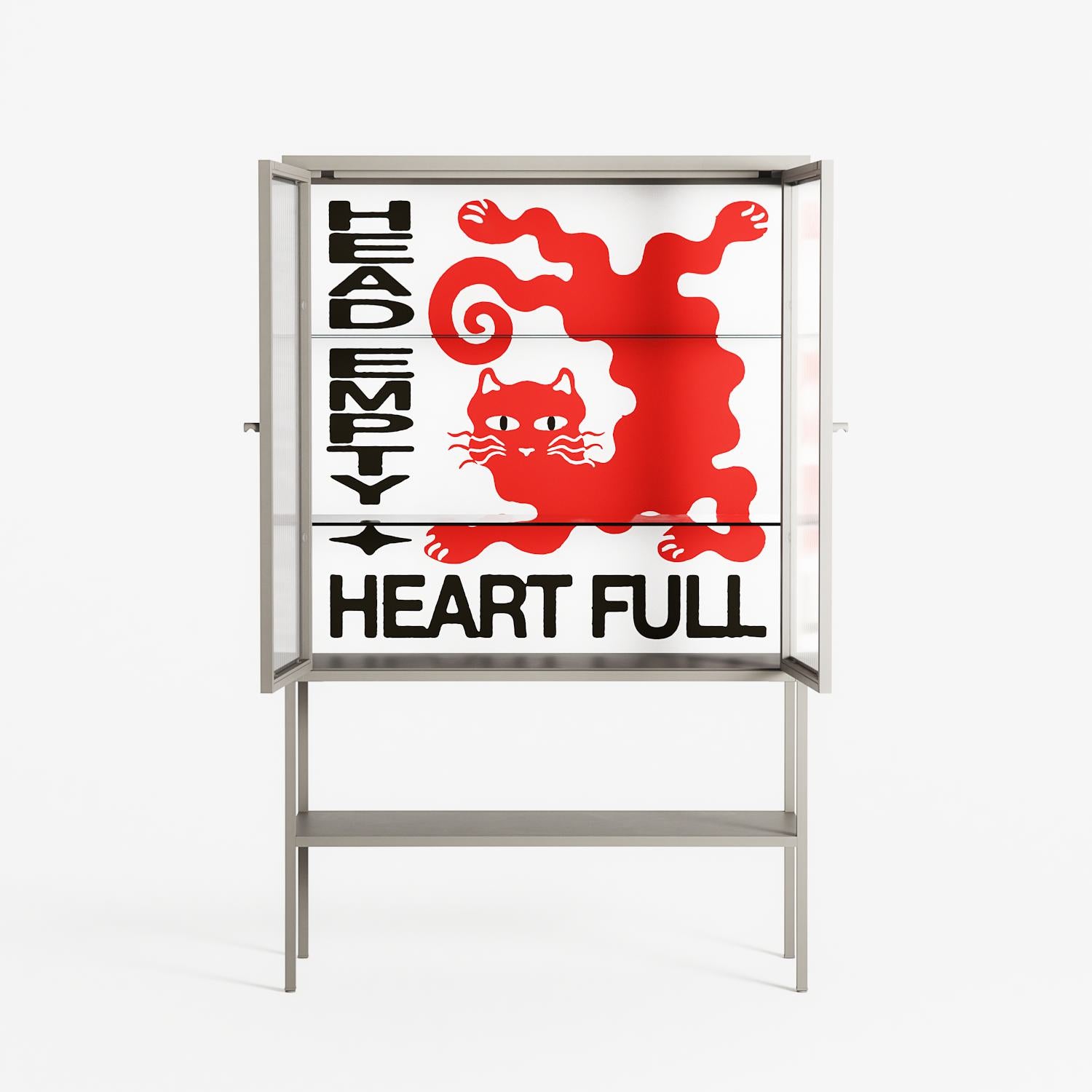 Heart Full by Alexander Khabbazi, displayed within the Vitrine Loft Cabinet behind Reeded glass. Finished in the colour Pebble, the cabinet becomes a frame for the artwork and the objects within.
