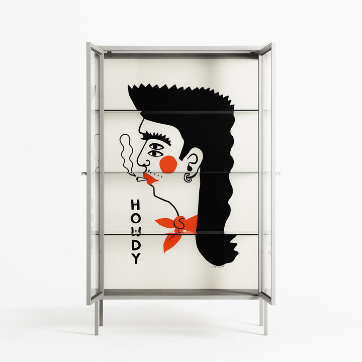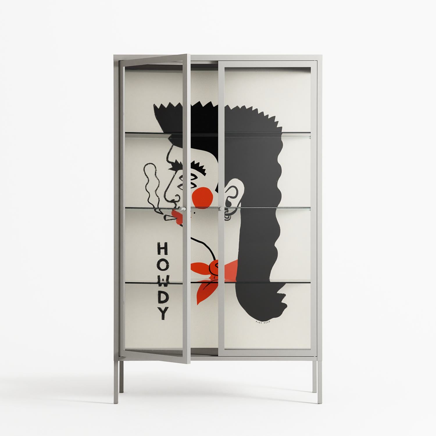 Howdy by Aley Wild, displayed within the Vitrine Cabinet behind Clear glass. Finished in the colour Chalk, the cabinet becomes a frame for the artwork and the objects within.