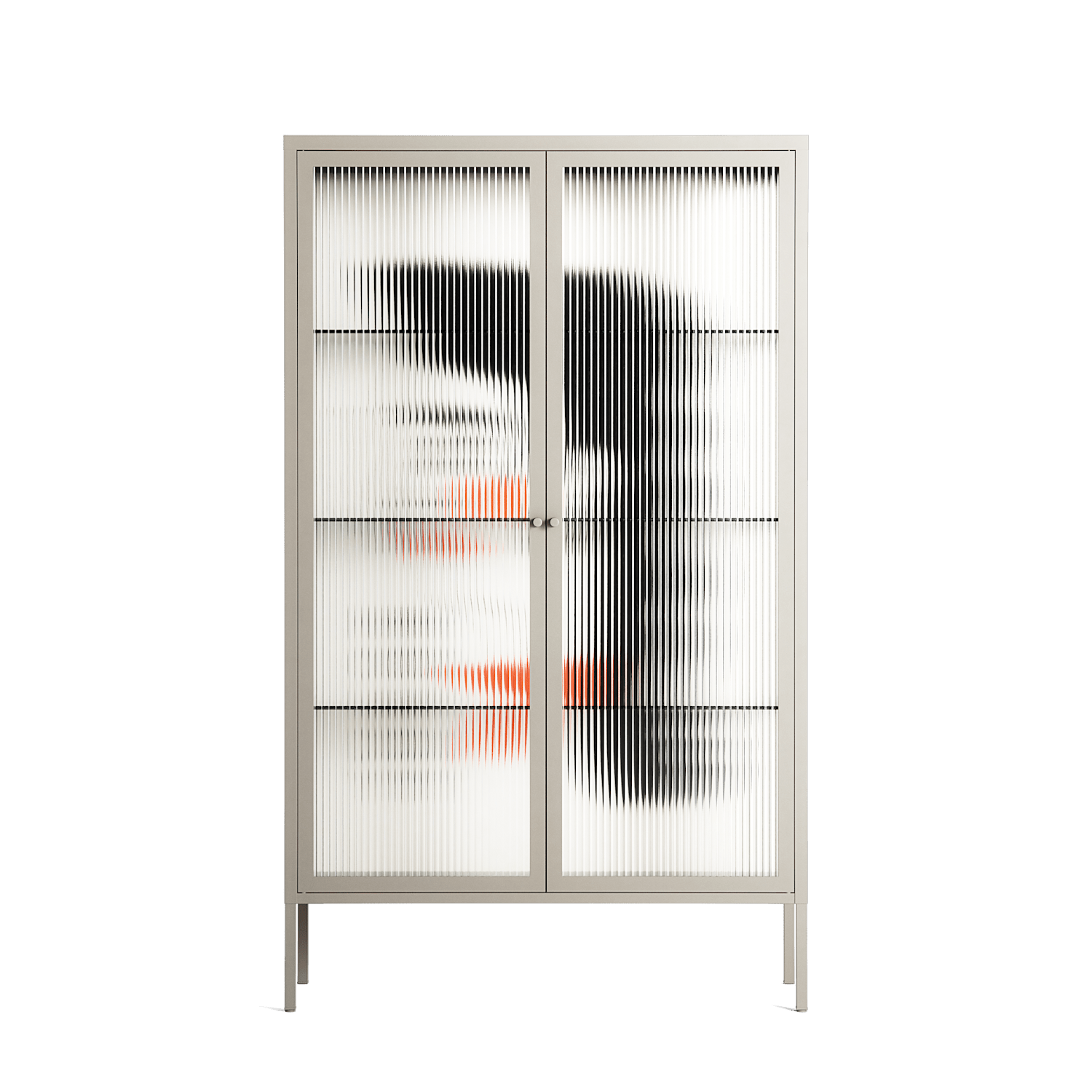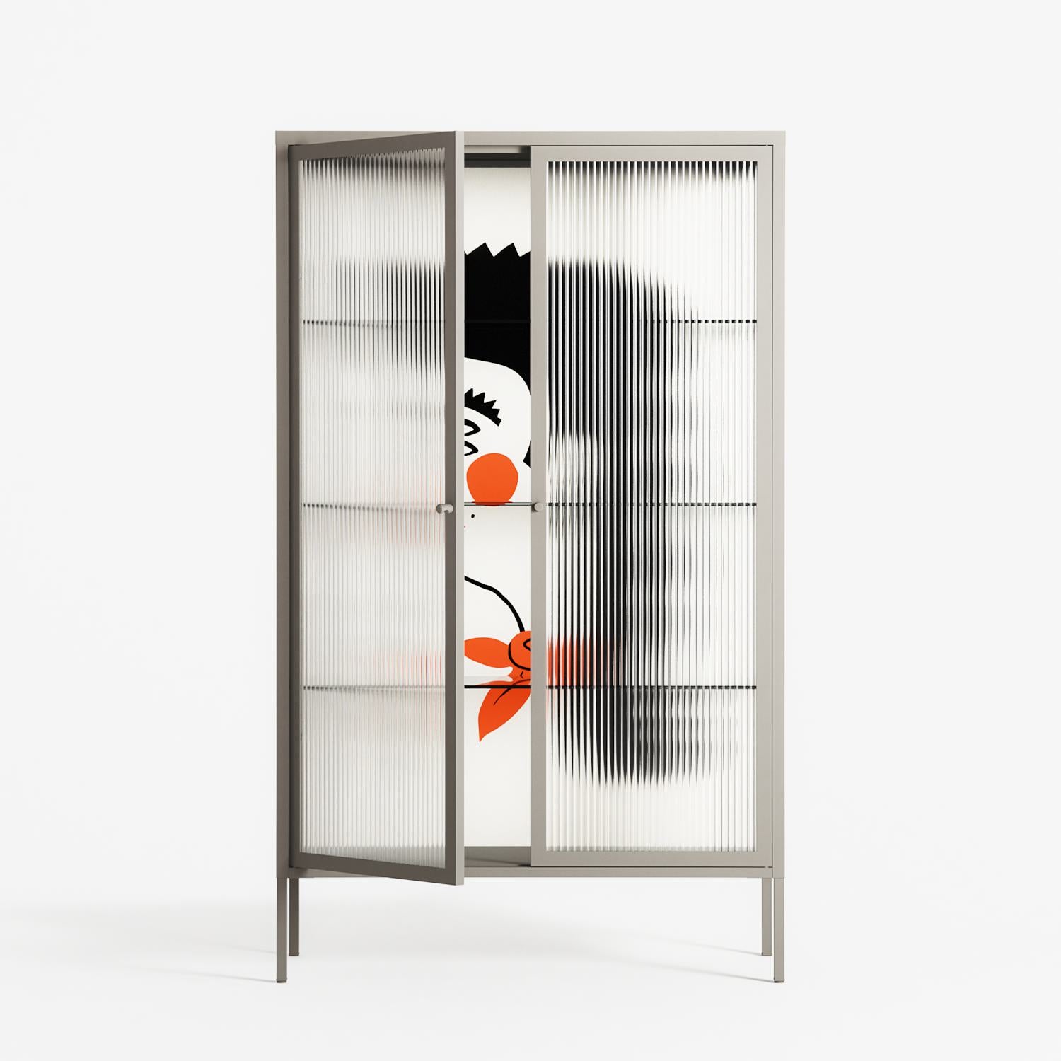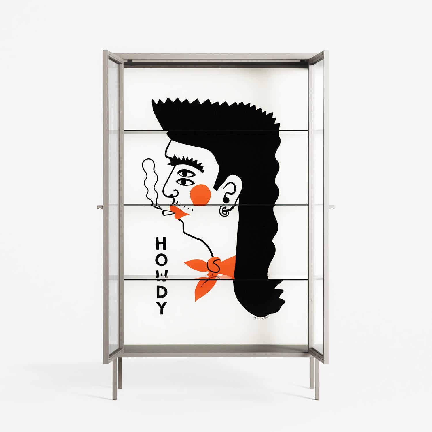 Howdy by Aley Wild, displayed within the Vitrine Cabinet behind Reeded glass. Finished in the colour Pebble, the cabinet becomes a frame for the artwork and the objects within.
