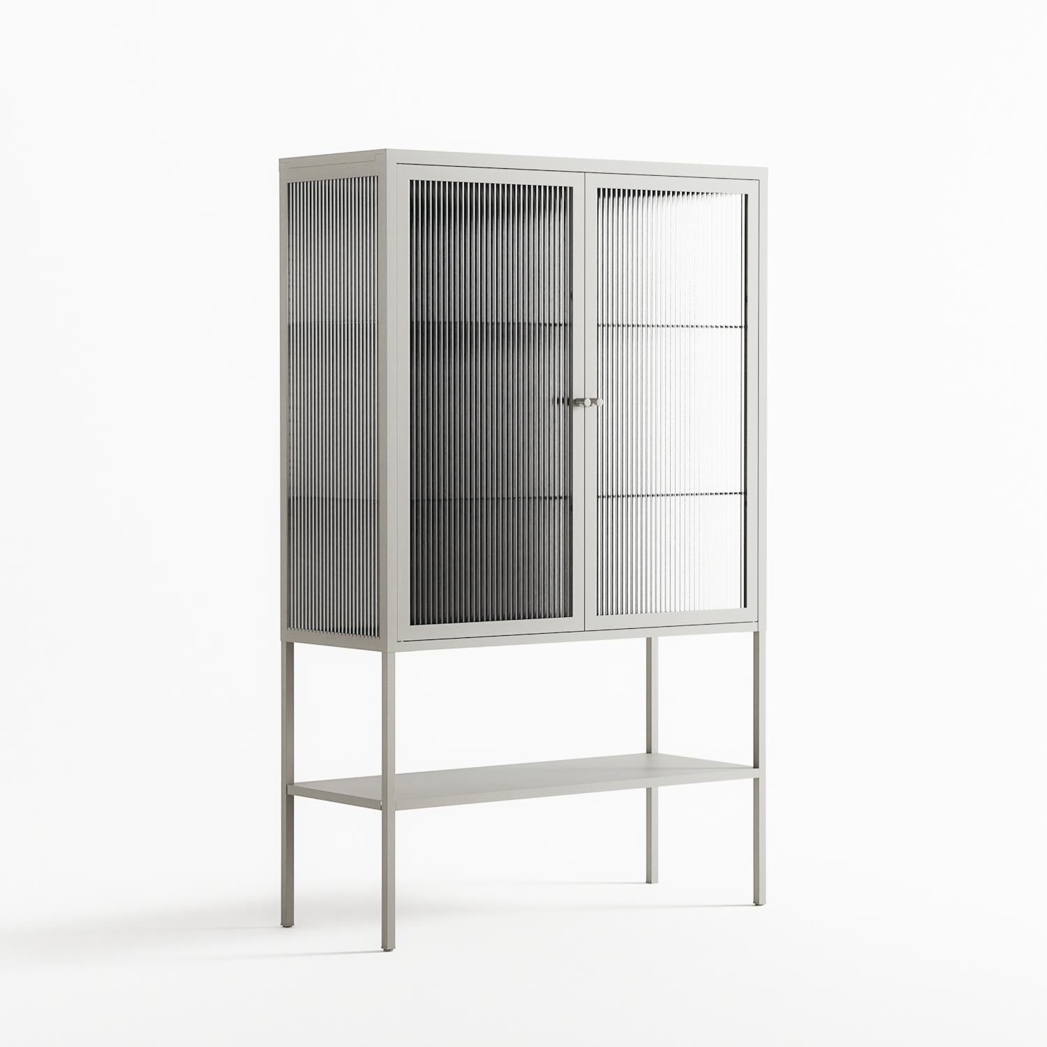 Hug 1 by Andrea Devia-Nuño, displayed within the Vitrine Loft Cabinet behind Reeded glass. Finished in the colour Chalk, the cabinet becomes a frame for the artwork and the objects within.