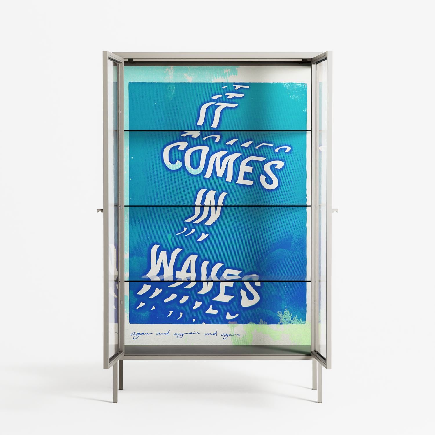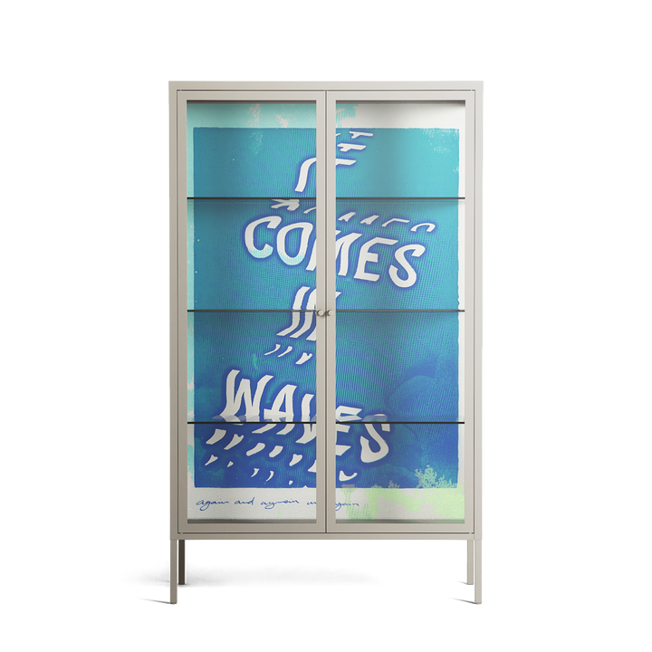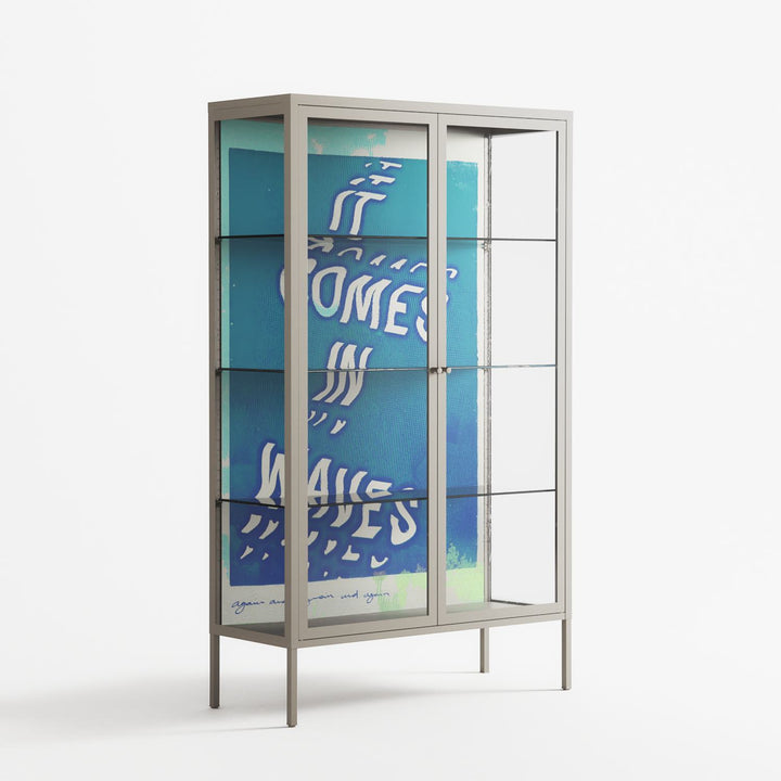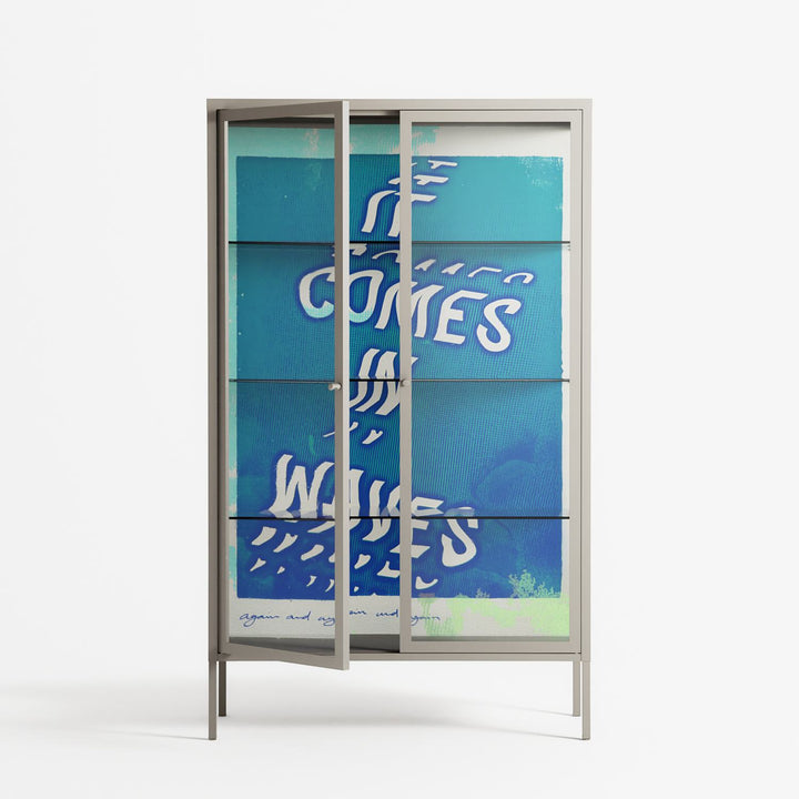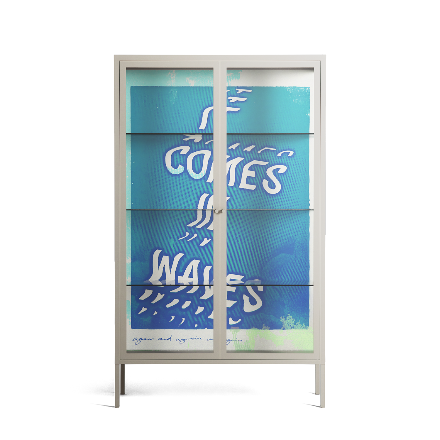 It Comes in Waves by Ciara Wade, displayed within the Vitrine Cabinet behind Clear glass. Finished in the colour Pebble, the cabinet becomes a frame for the artwork and the objects within.