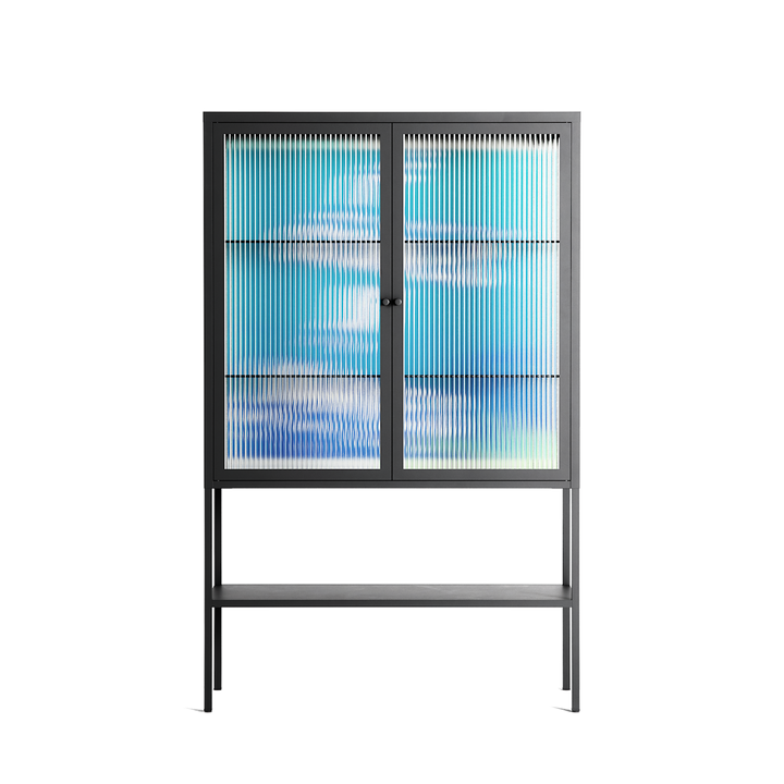 It Comes in Waves by Ciara Wade, displayed within the Vitrine Loft Cabinet behind Reeded glass. Finished in the colour Antracite, the cabinet becomes a frame for the artwork and the objects within.