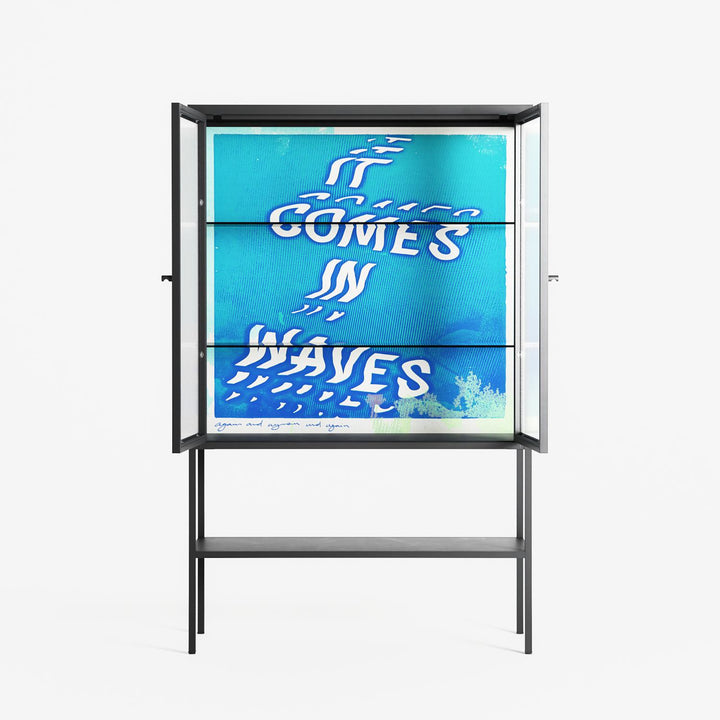 Vitrine pairs artworks by artists, designers, and creatives from around the world with a frame that elevates and displays them in everyday space. The cabinet is built from precision-cut metal with a powder-coated finish — resistant to wear and crafted for stability — making it ideal for both office and home spaces.