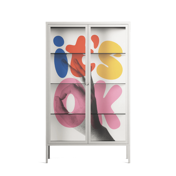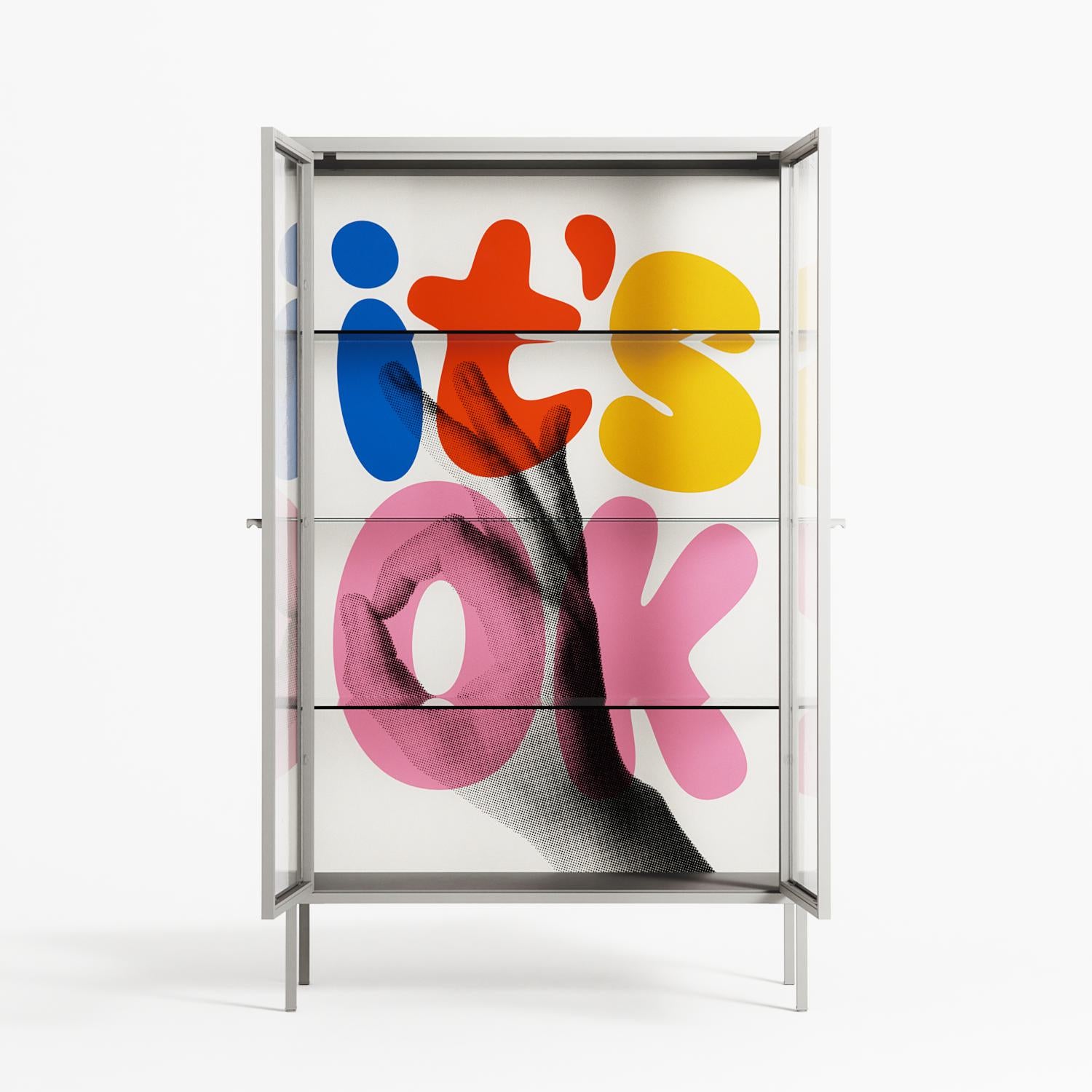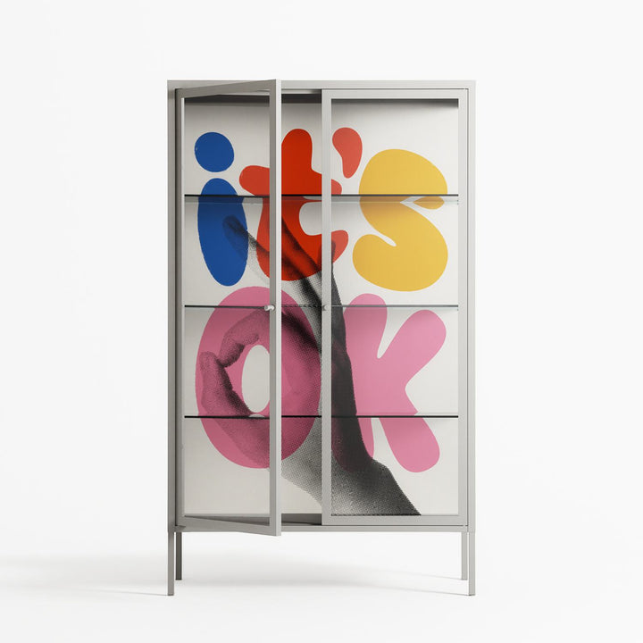 Its Ok by Vratislav Pecka, displayed within the Vitrine Cabinet behind Clear glass. Finished in the colour Chalk, the cabinet becomes a frame for the artwork and the objects within.