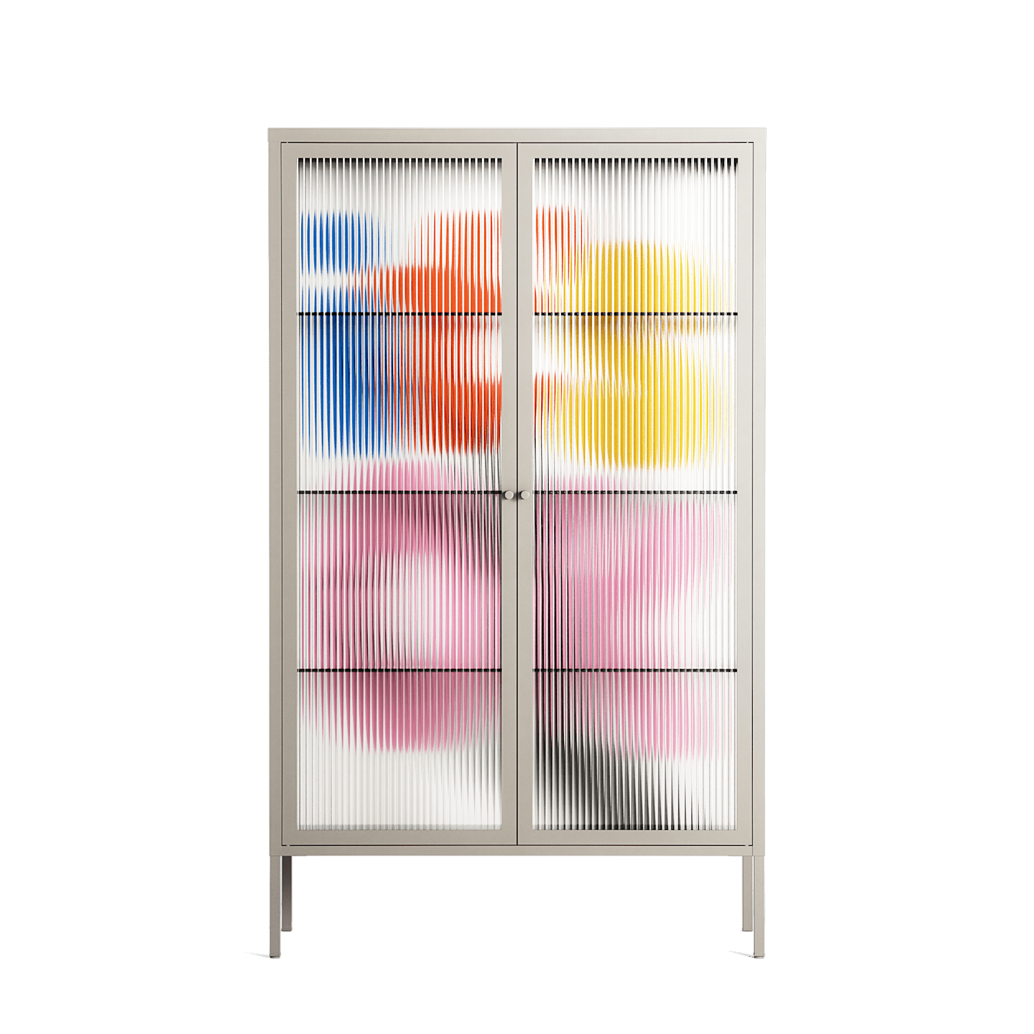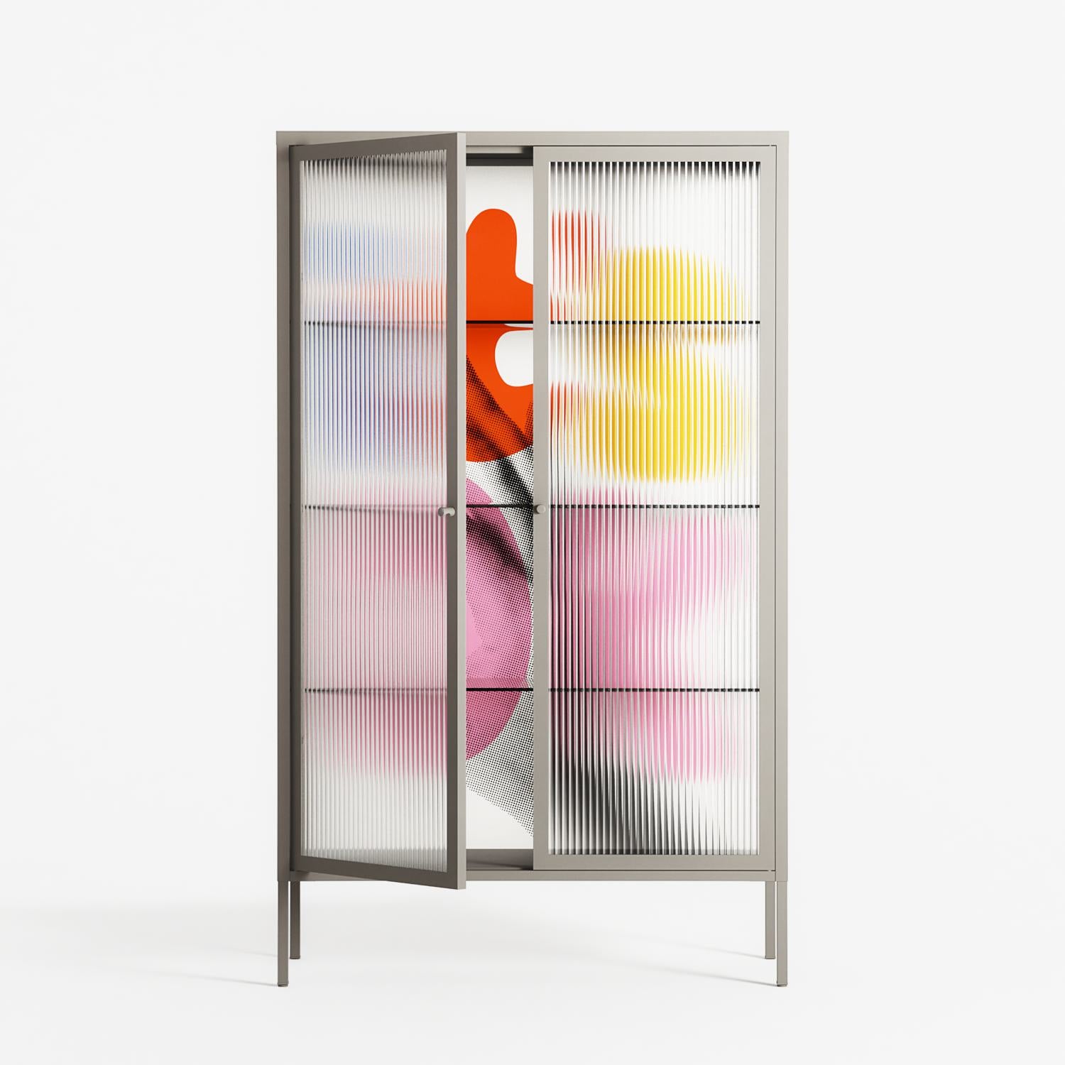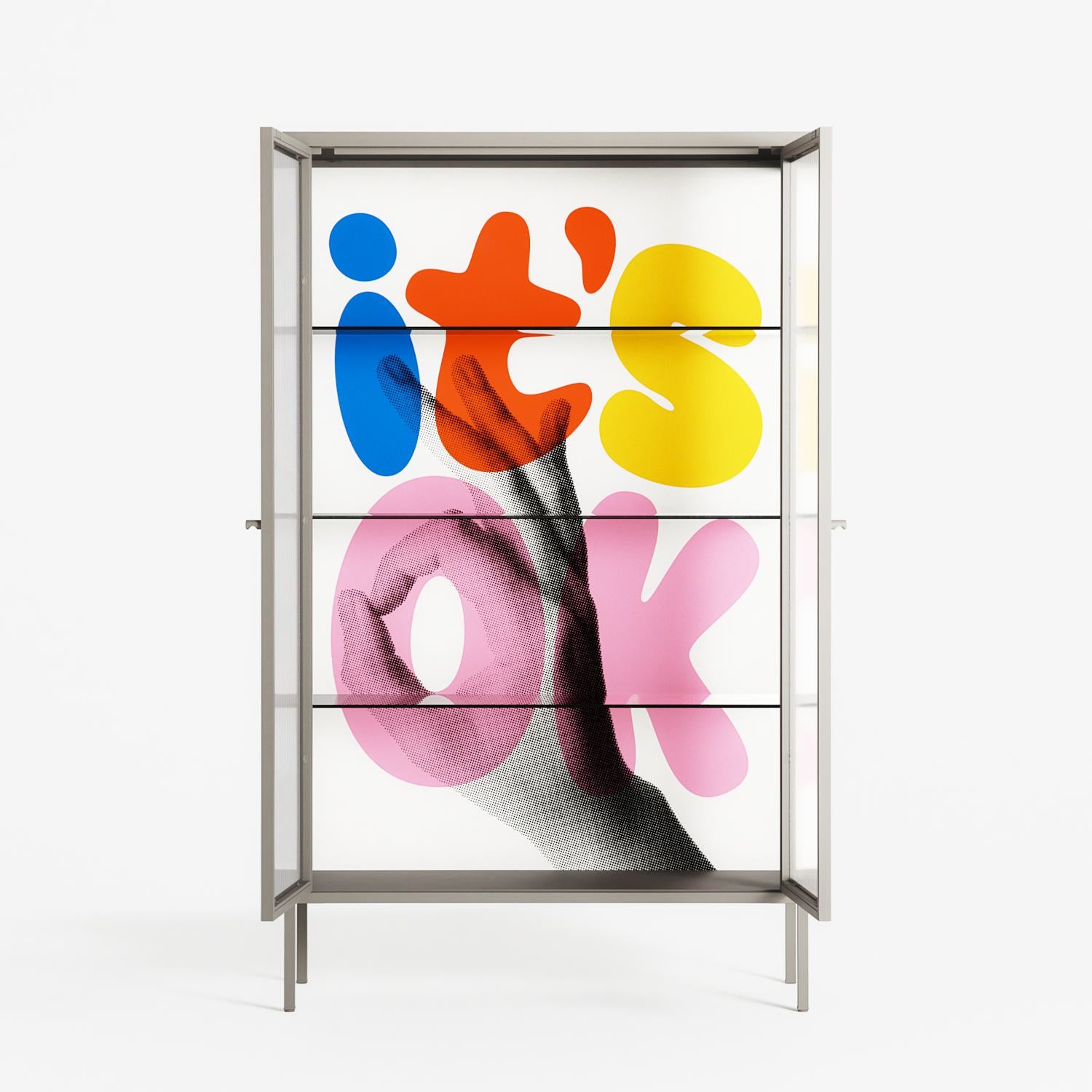 Its Ok by Vratislav Pecka, displayed within the Vitrine Cabinet behind Reeded glass. Finished in the colour Pebble, the cabinet becomes a frame for the artwork and the objects within.