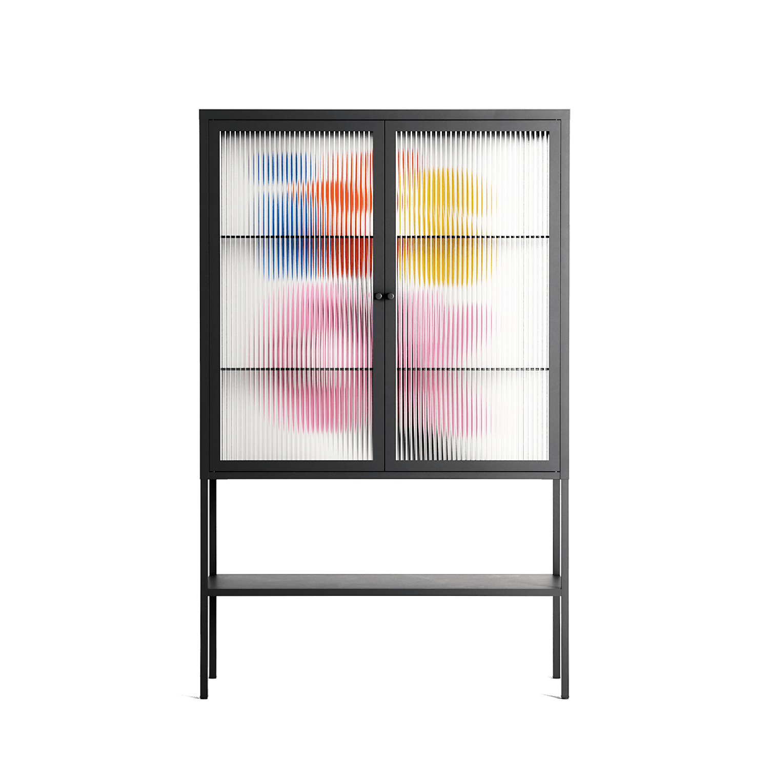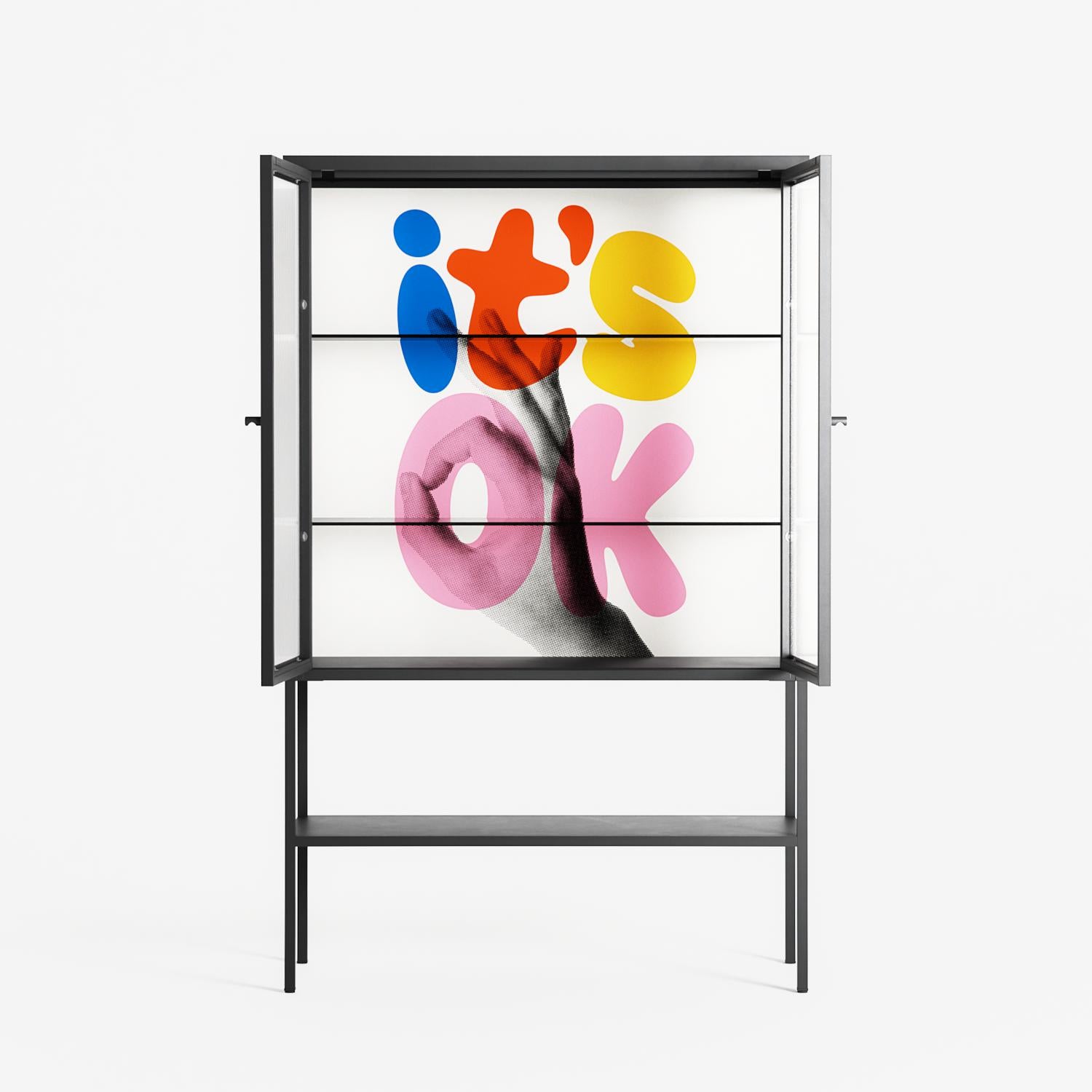 Its Ok by Vratislav Pecka, displayed within the Vitrine Loft Cabinet behind Reeded glass. Finished in the colour Antracite, the cabinet becomes a frame for the artwork and the objects within.