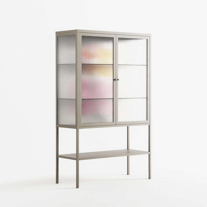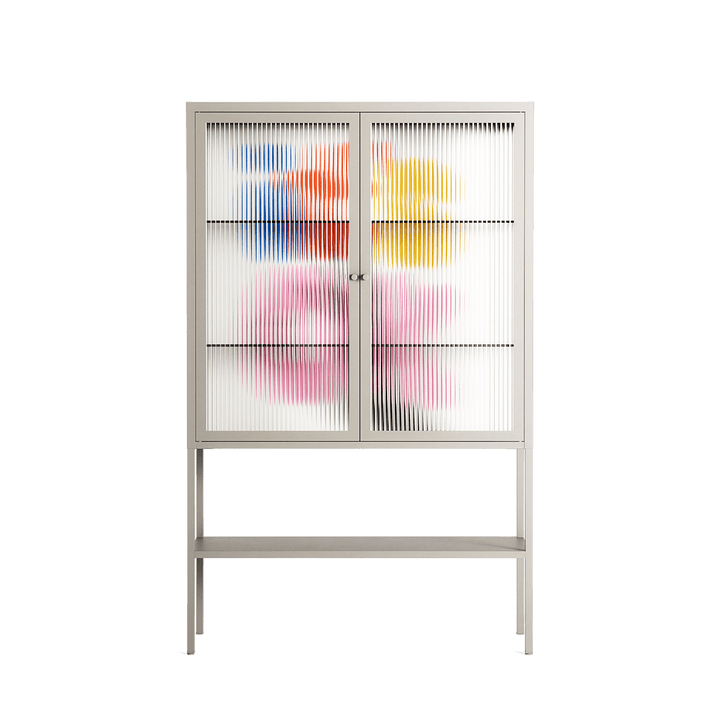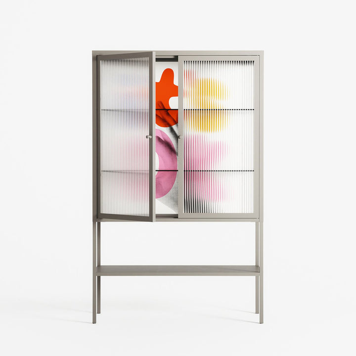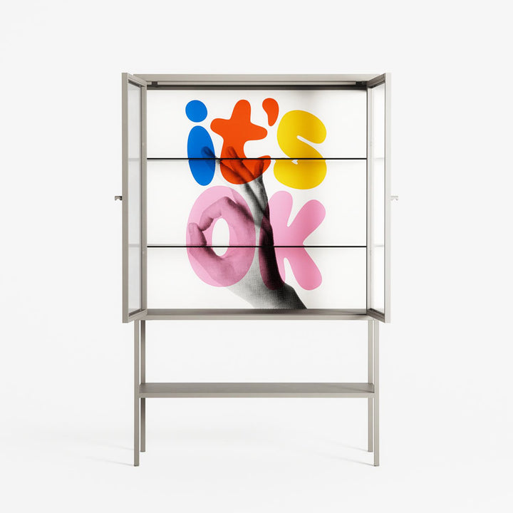 Its Ok by Vratislav Pecka, displayed within the Vitrine Loft Cabinet behind Reeded glass. Finished in the colour Pebble, the cabinet becomes a frame for the artwork and the objects within.